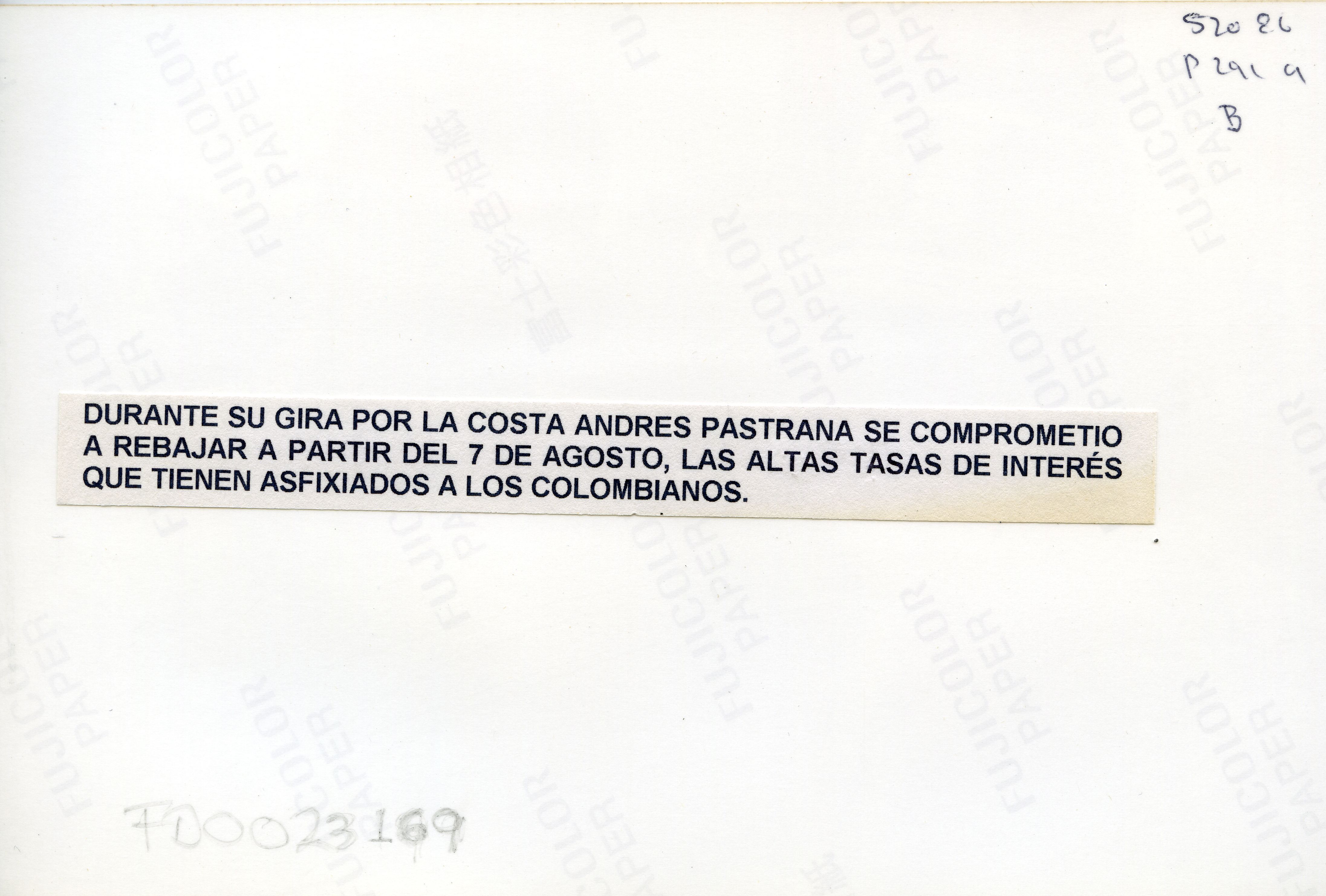 Al reverso de la fotografía se anexa recorte: "Durante su gira por la costa Andrés Pastrana se comprometió a rebajar a partir del 7 de agosto, las altas tasas de interés que tienen asfixiados a los colombianos."