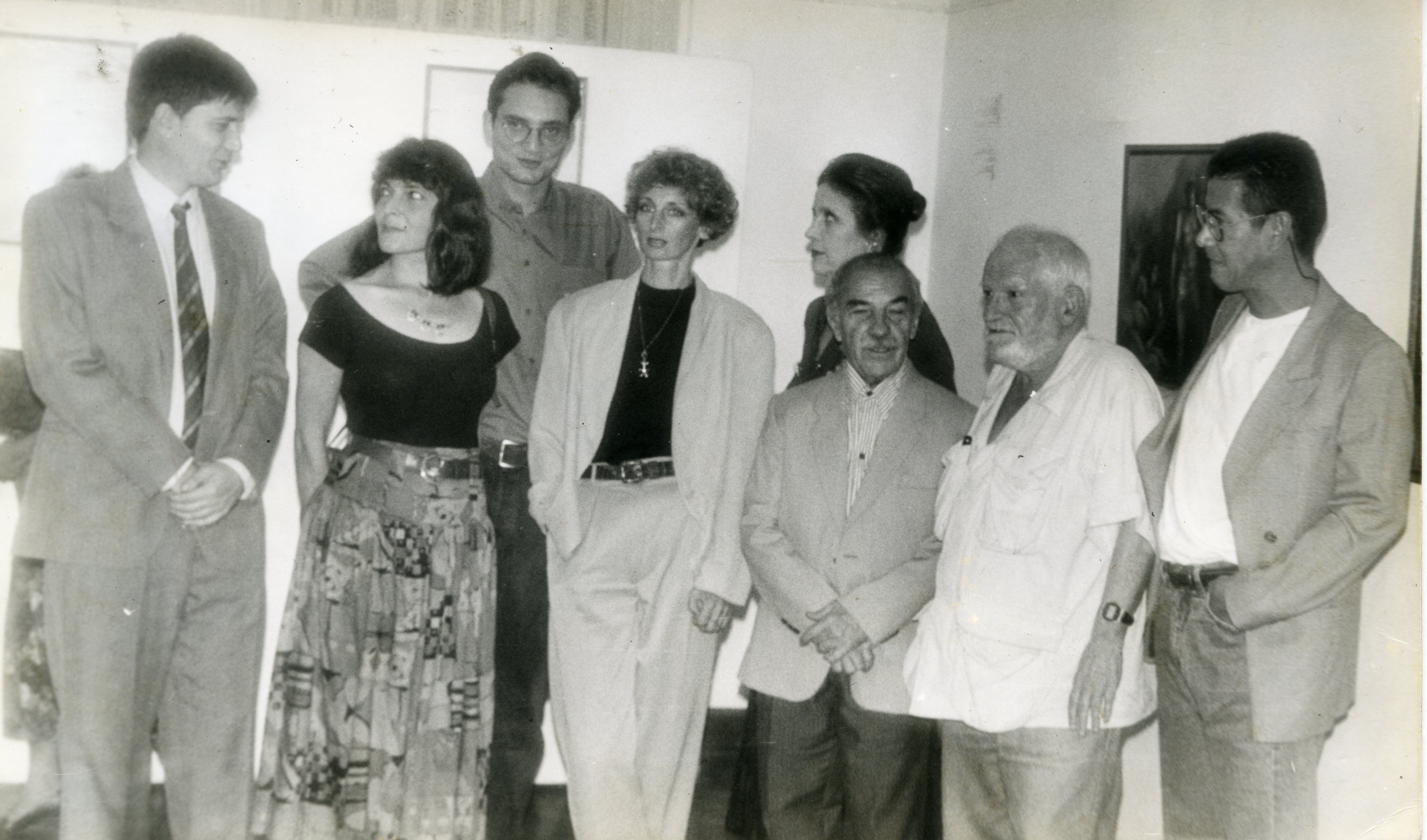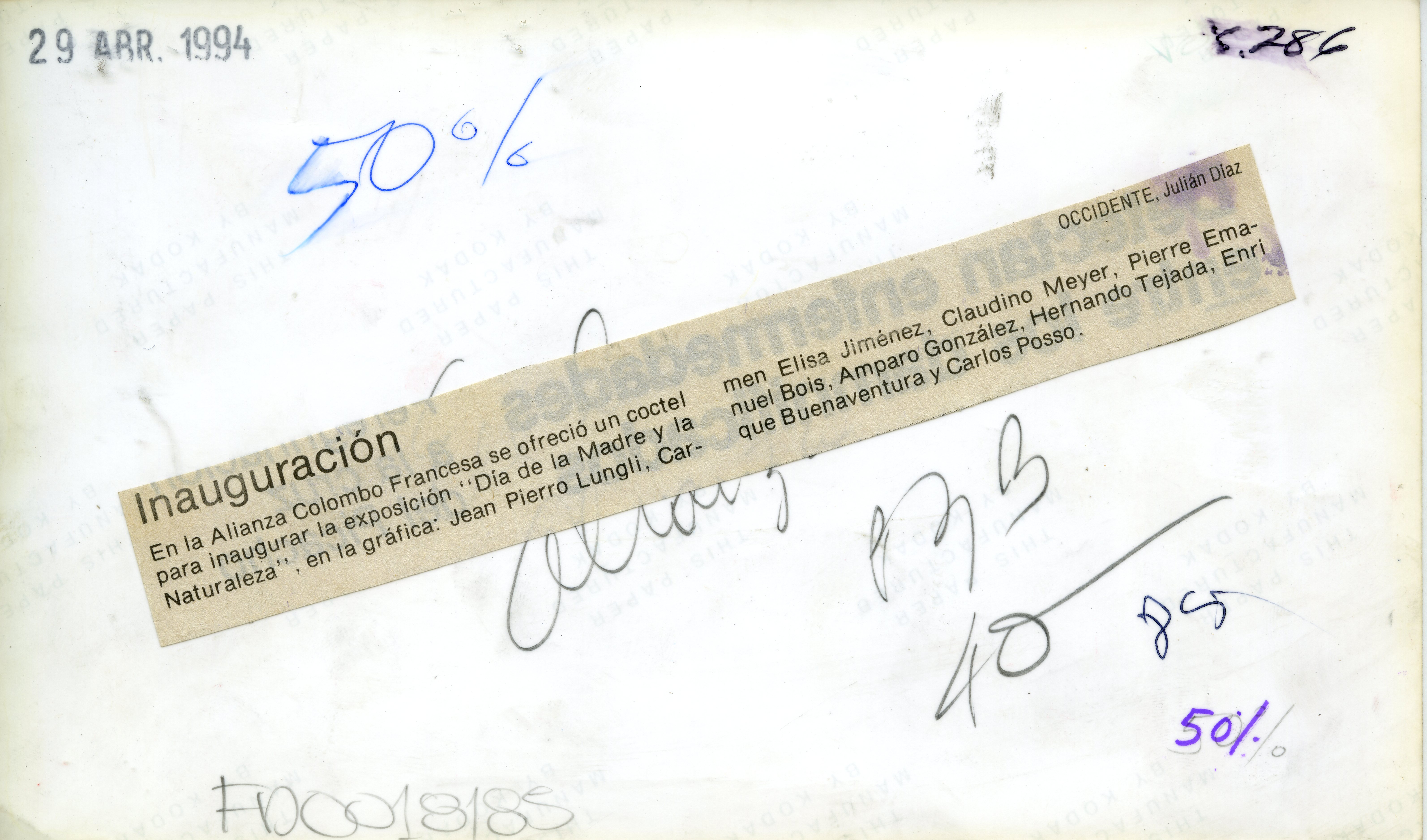 Al reverso de la fotografía se anexa recorte:" En la Alianza Colombo Francesa se ofreció un cóctel para inaugurar la exposición "Día de la Madre y la Naturaleza", en la gráfica: Jean Pierro Lungli, Carmen Eliza Jiménez, Claudino Meyer,Pierre Emanuel Bois, Amparo González, Hernando Tejada, Enrique Buenaventura y Carlos Posso."