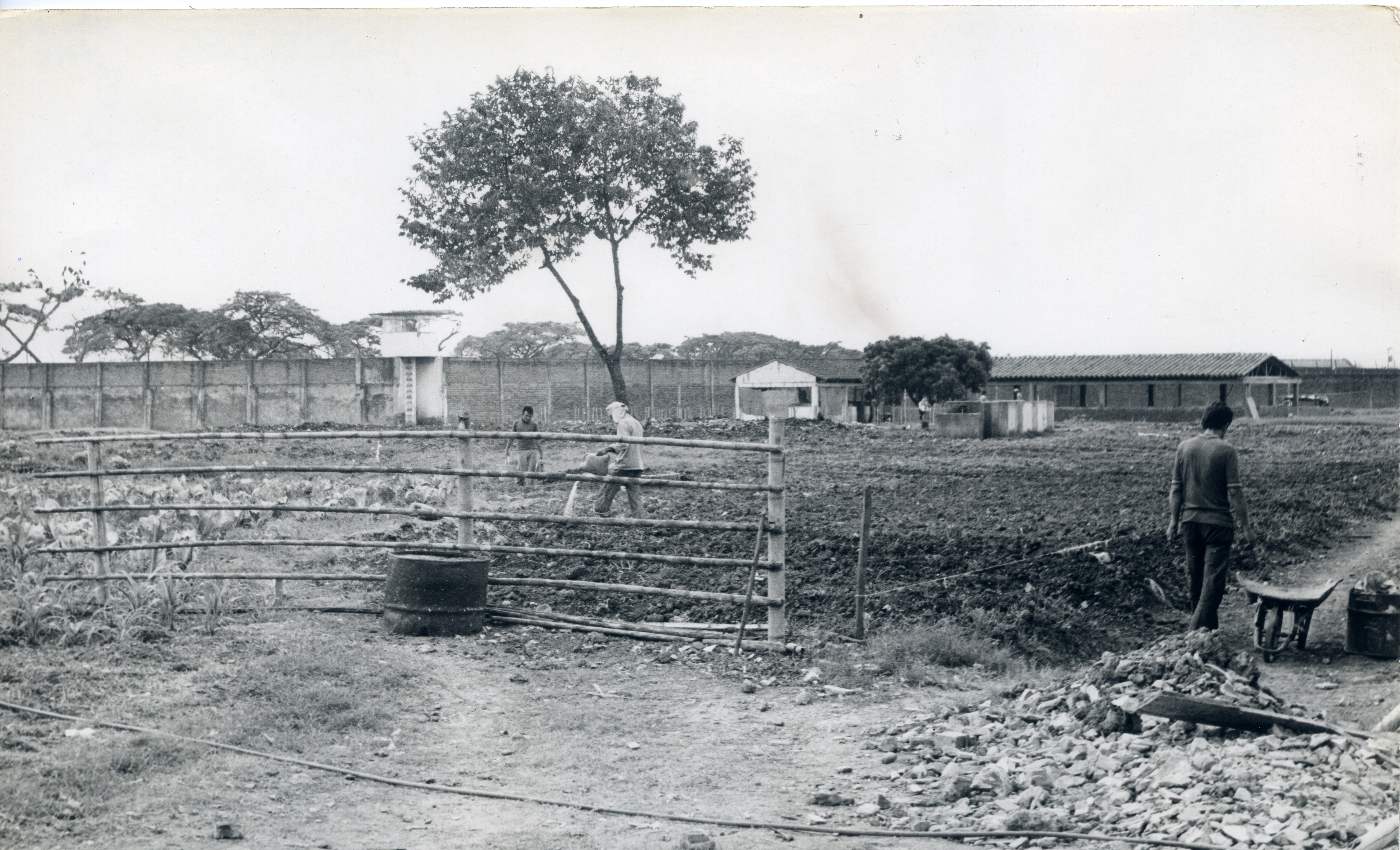Se observan las huertas en los interiores de la cárcel de Villanueva, mientras hay trabajadores y reclusos en ellas.