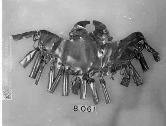 Nariguera semilunar con colgantes. Período Yotoco, Calima. Museo del Oro. Bogotá.