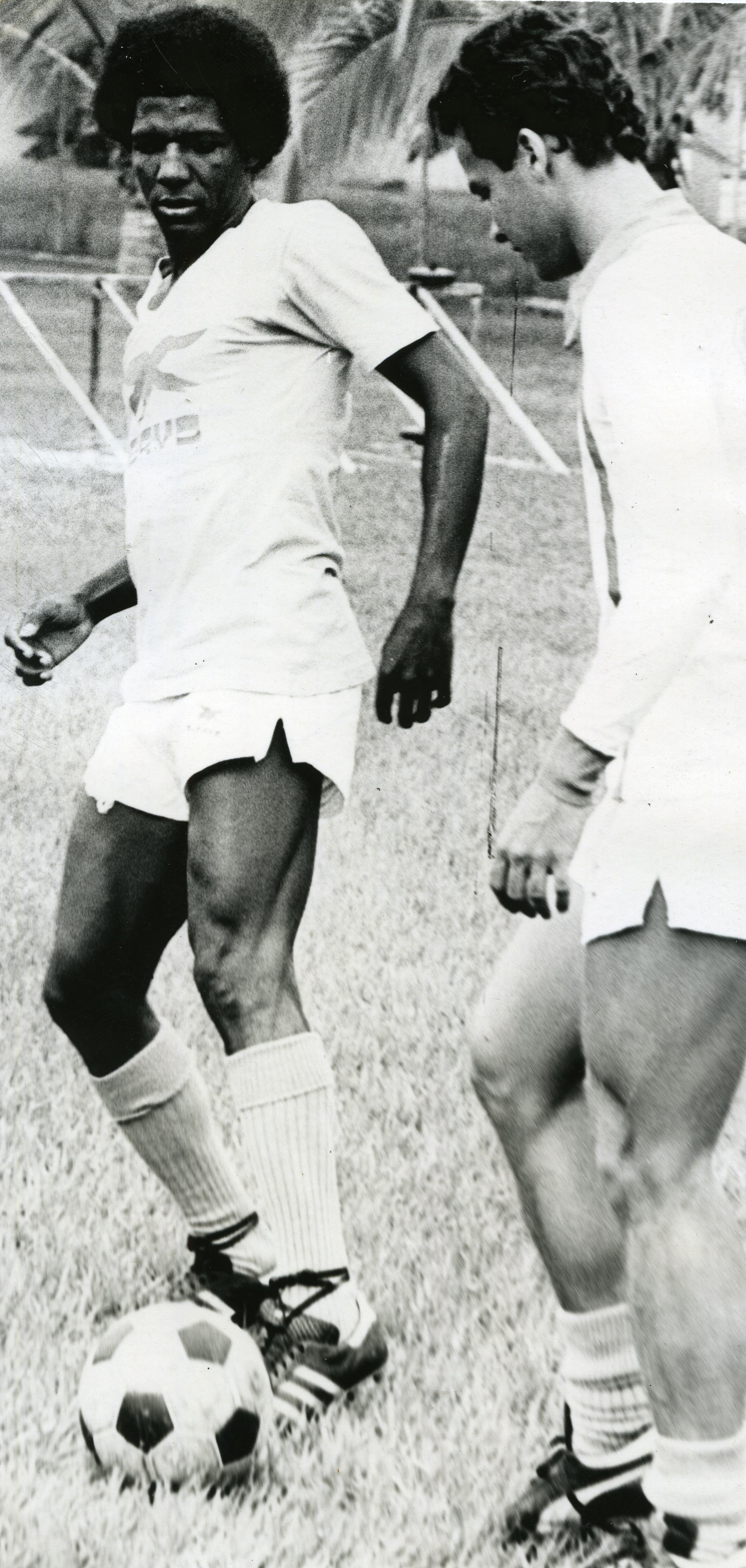 Víctor Lugo fue conocido como el “fabricador de penales” por la cantidad de este tipo de faltas que le pitaron a su favor, durante su carrera deportiva. Anotó 76 goles con el equipo, incluyendo el segundo tanto que le daría a la institución su primer titulo, en 1979. Participó también en la Selección Colombia. Observamos al jugador en un entreno, acompañado de Víctor Espinoza.