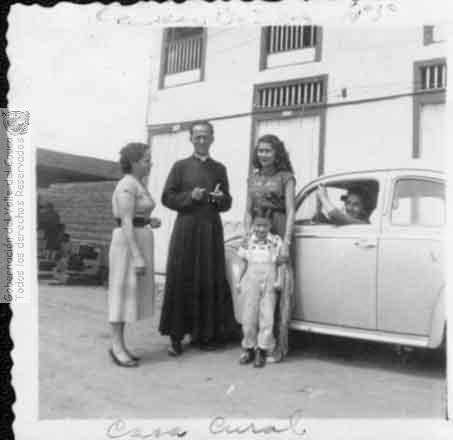 Pbro. Luís H. Ramírez, junto a él, Deyanira Osorio, Mery Benítez, el niño Gustavo Osorio y Marina Ramírez en el carro. Zarzal, 1965