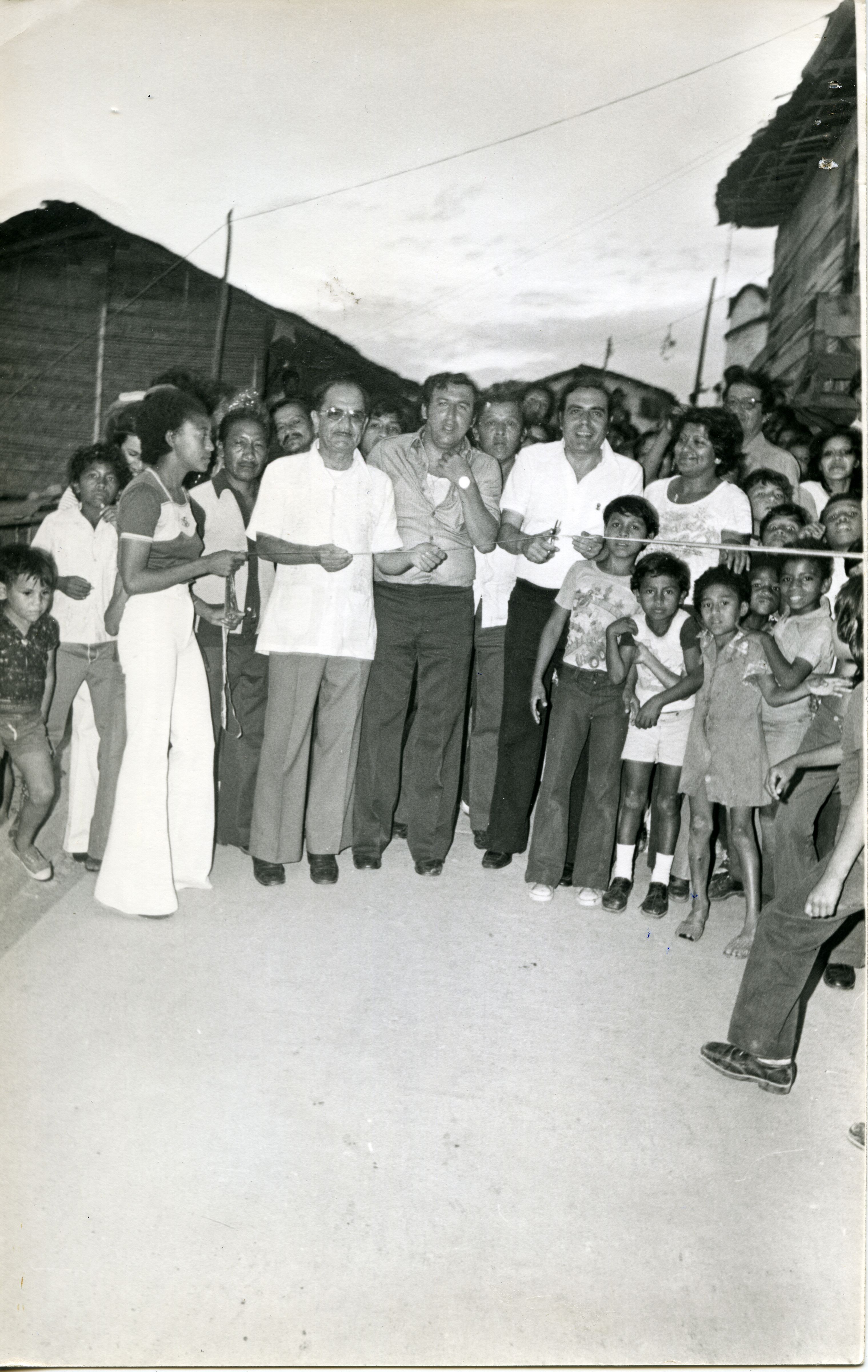 La foto retrata el momento cuando el entonces alcalde de Cali, Ernesto González Caicedo corta una cinta de apertura en el barrio Siloé, ante la mirada atenta de la comunidad.