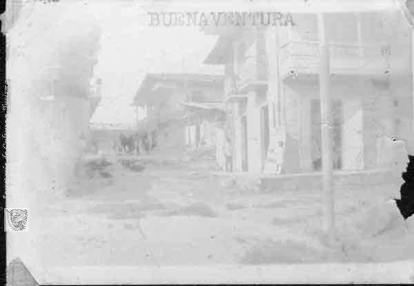 La fotografía nos muestra una calle del municipio de Buenaventura, donde apreciamos las construcciones en madera como se acostumbraba. C. 1940