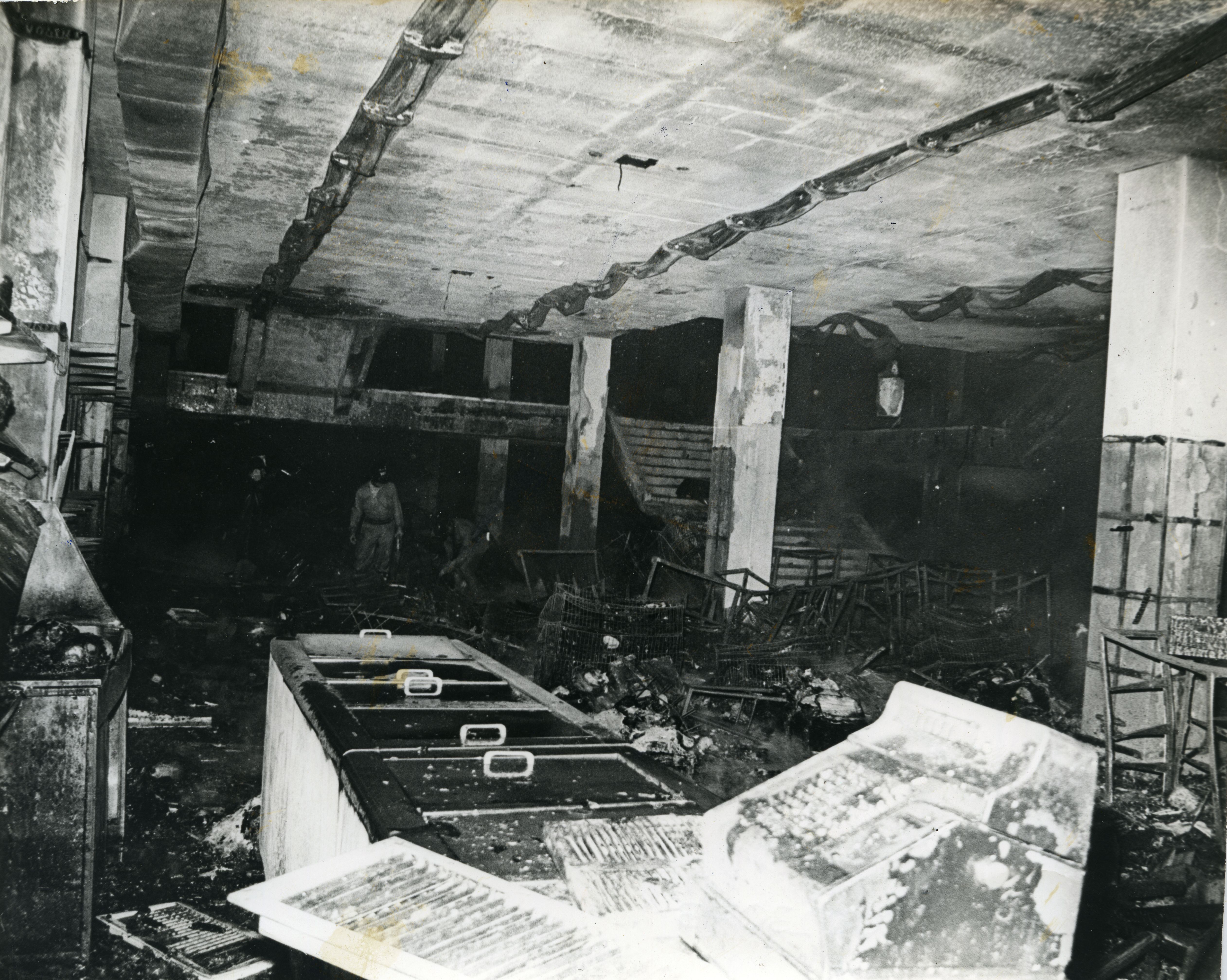 Atentado en La 14 de Cosmocentro. Se aprecia como quedo arrasado totalmente el sitio .Aspecto en el interior del centro comercial y bservamos integrantes del Cuerpo de Bomberos Voluntarios