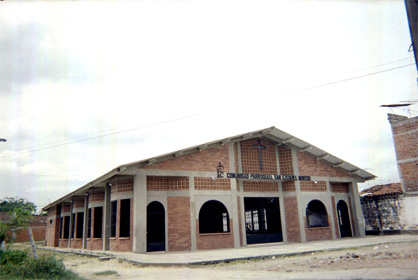 Imagen tomada en exterior, donde se puede apreciar la fachada de la parroquia del barrio, con muros de ladrillo a la vista y algunos arcos en concreto