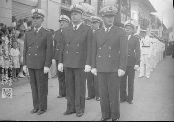 Integrantes del Cuerpo de Bomberos durante la procesión de la Virgen de los Remedios hasta la capilla de la Merced.Santiago de Cali,1942