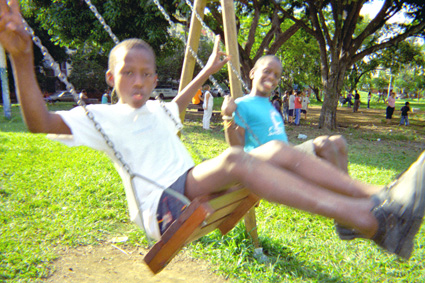 España Cruz, R. (2005). Plano medio de dos niños reunidos en un parque jugando en un columpio. Santiago de Cali: Biblioteca Departamental Jorge Garces Borrero.