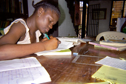 Plano medio. Una mujer estudiando en una mesa donde hay algunos libros. Imagen tomada con flash.