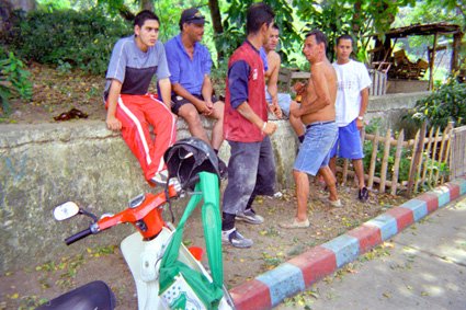 Plano medio. Grupo de hombres en ropa deportiva, dos de ellos en actitud de disputa. En la parte inferior izquierda se observa una moto y en su manubrio un casco y un maletin verde.