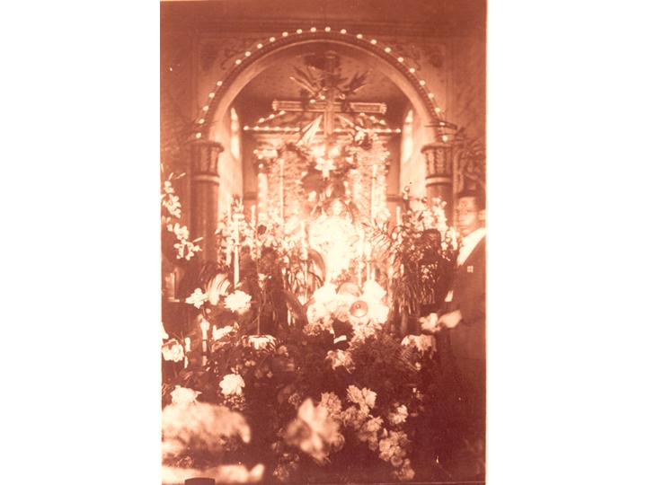 Ceremonia de velación del cuerpo del padre Rada en el interior del templo principal del municipio. El Cerrito, fecha aproximada, 1930.