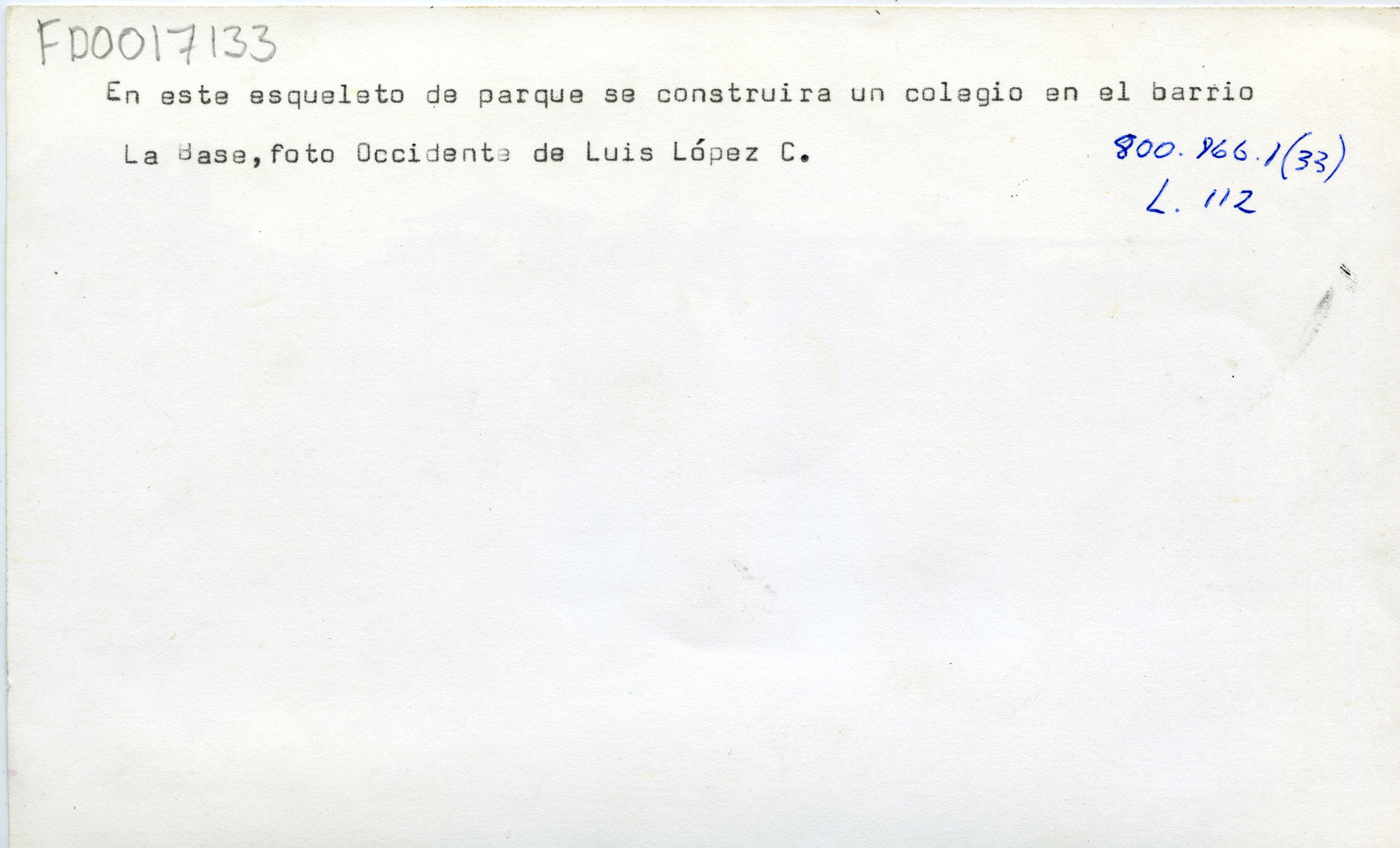 Al reverso de la fotografía se anexa nota mecanografiada: "En este esqueleto de parque se construirá un colegio en el barrio La Base."