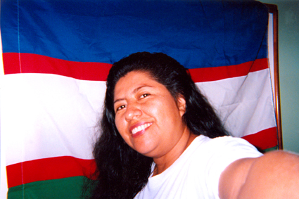Barahona, G. S. (2005). En este autorretrato hay una puesta en escena muy conciente de parte de la autora, ya que dispuso la bandera de Cali como fondo para la imagen. Santiago de Cali: Biblioteca Departamental Jorge Garces Borrero.