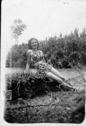 Mary Walleus, en la orilla del río Bugalagrande luciendo un traje de baño de dos piezas. Bugalagrande. C. 1949.