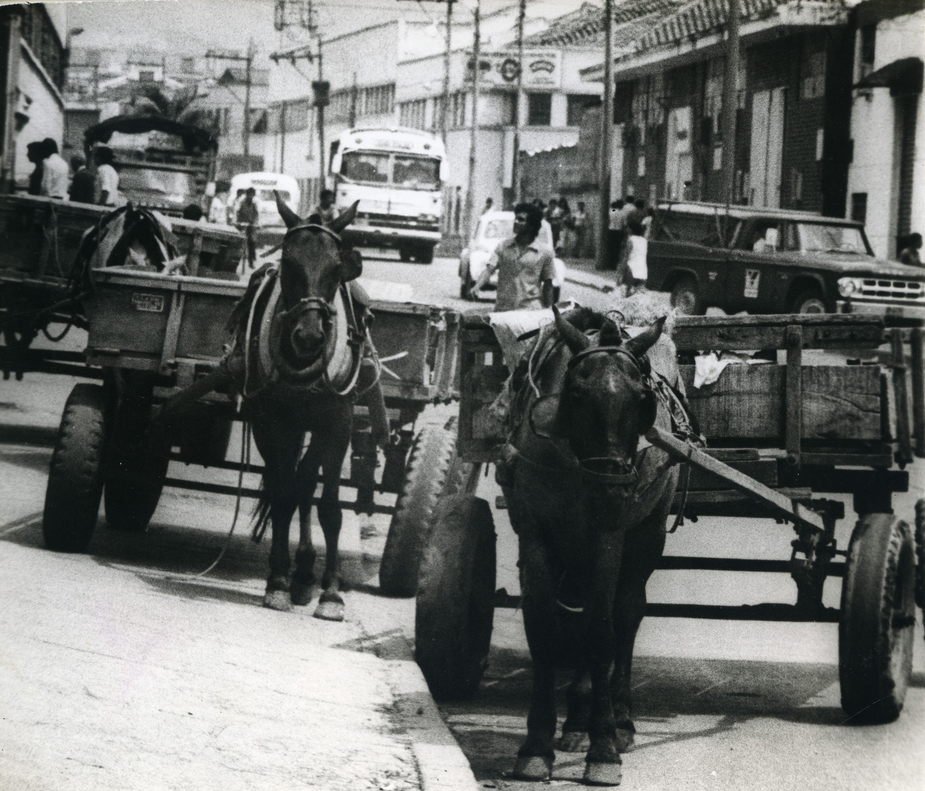 Sobre la calle y parte del andén se observan tres carretillas, dos al frente y una atrás.