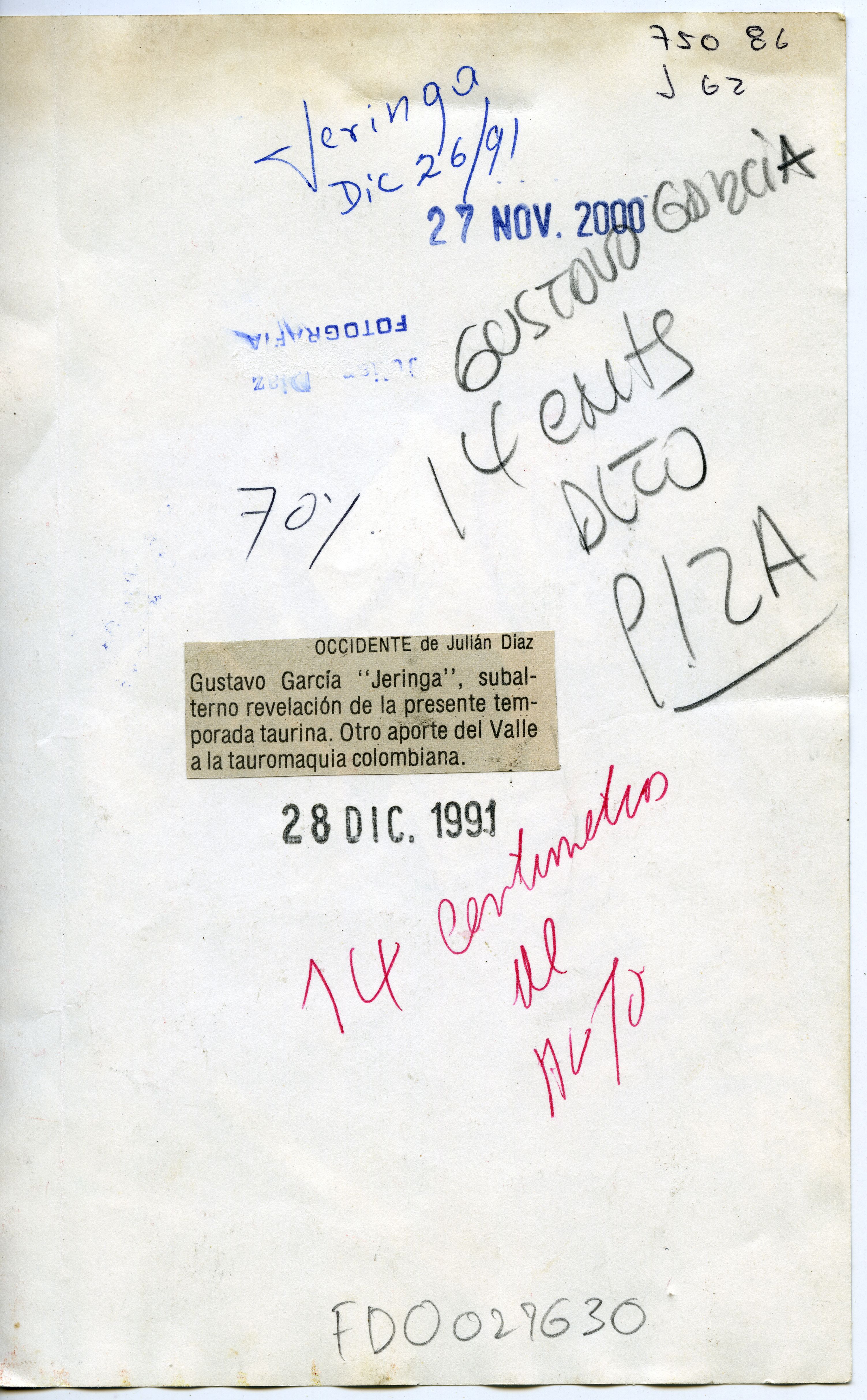 Foto de Gustavo García, banderillero, rehiletero.