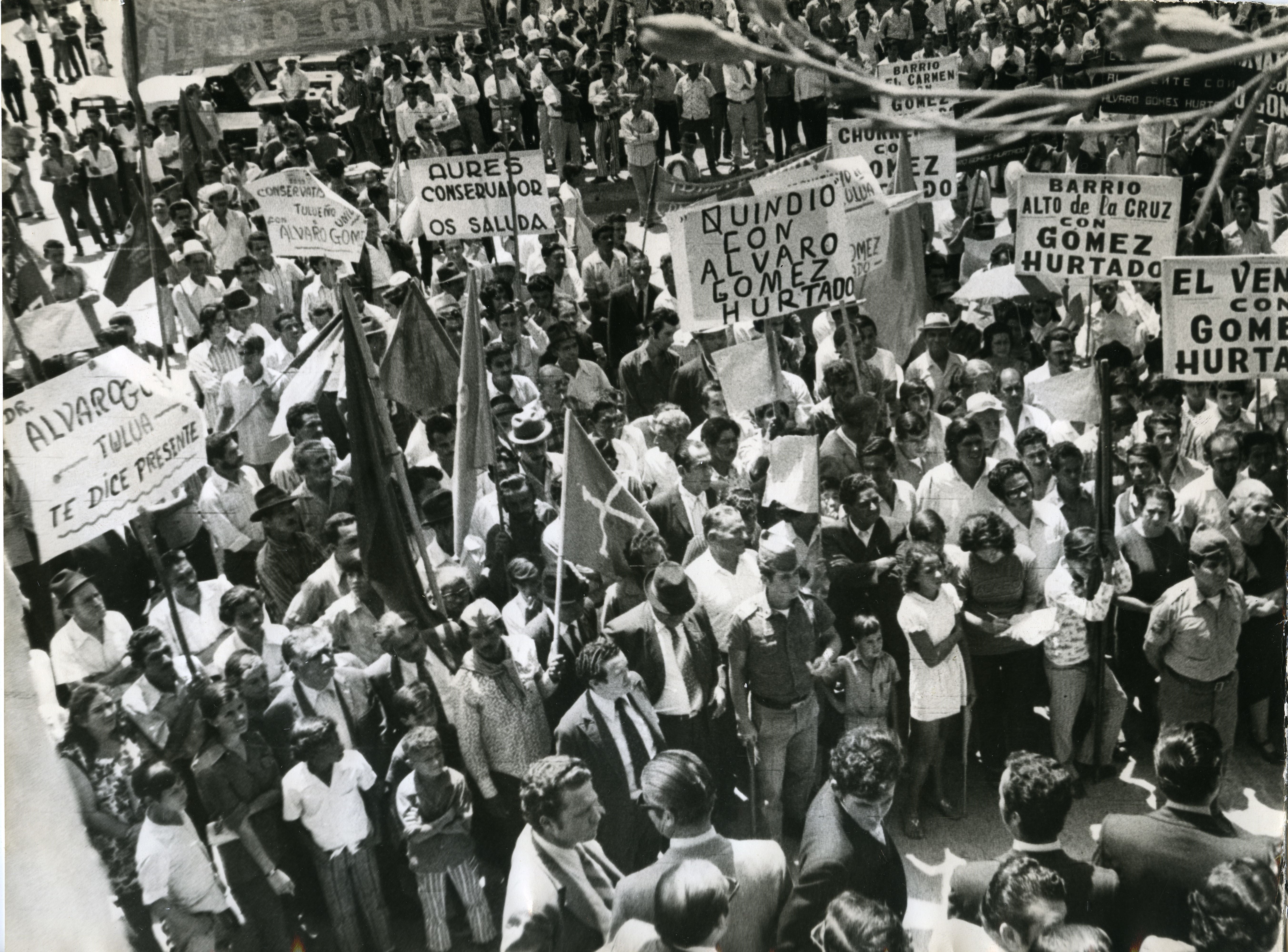 En la fotografía podemos apreciar al señor Álvaro Gómez Hurtado en una de sus campañas políticas, se encuentra rodeado por n gran número de sus seguidores, quienes lo apoyan fielmente.