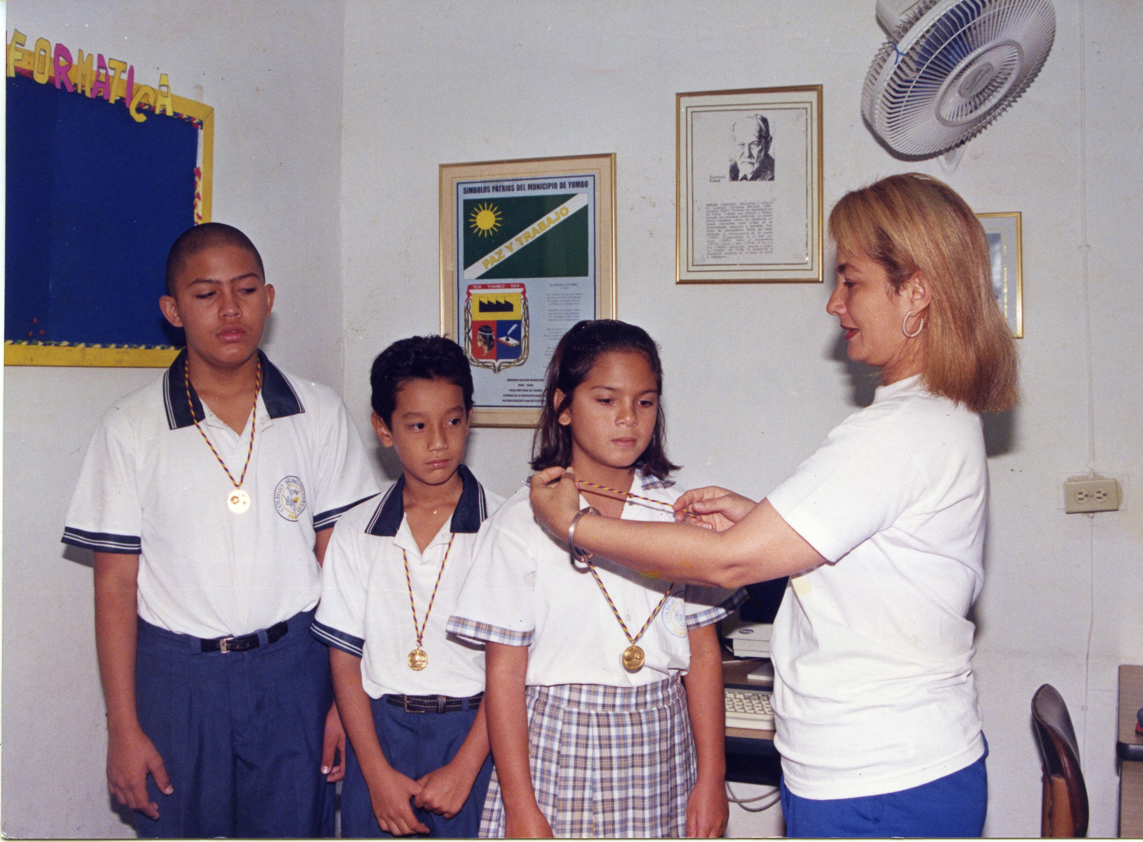 Fotografía de plano largo, donde se ven dos niños una niña y una mujer adulta, podemos observar que los niños y la niña tienen alrededor de sus cuellos medallas, podemos
