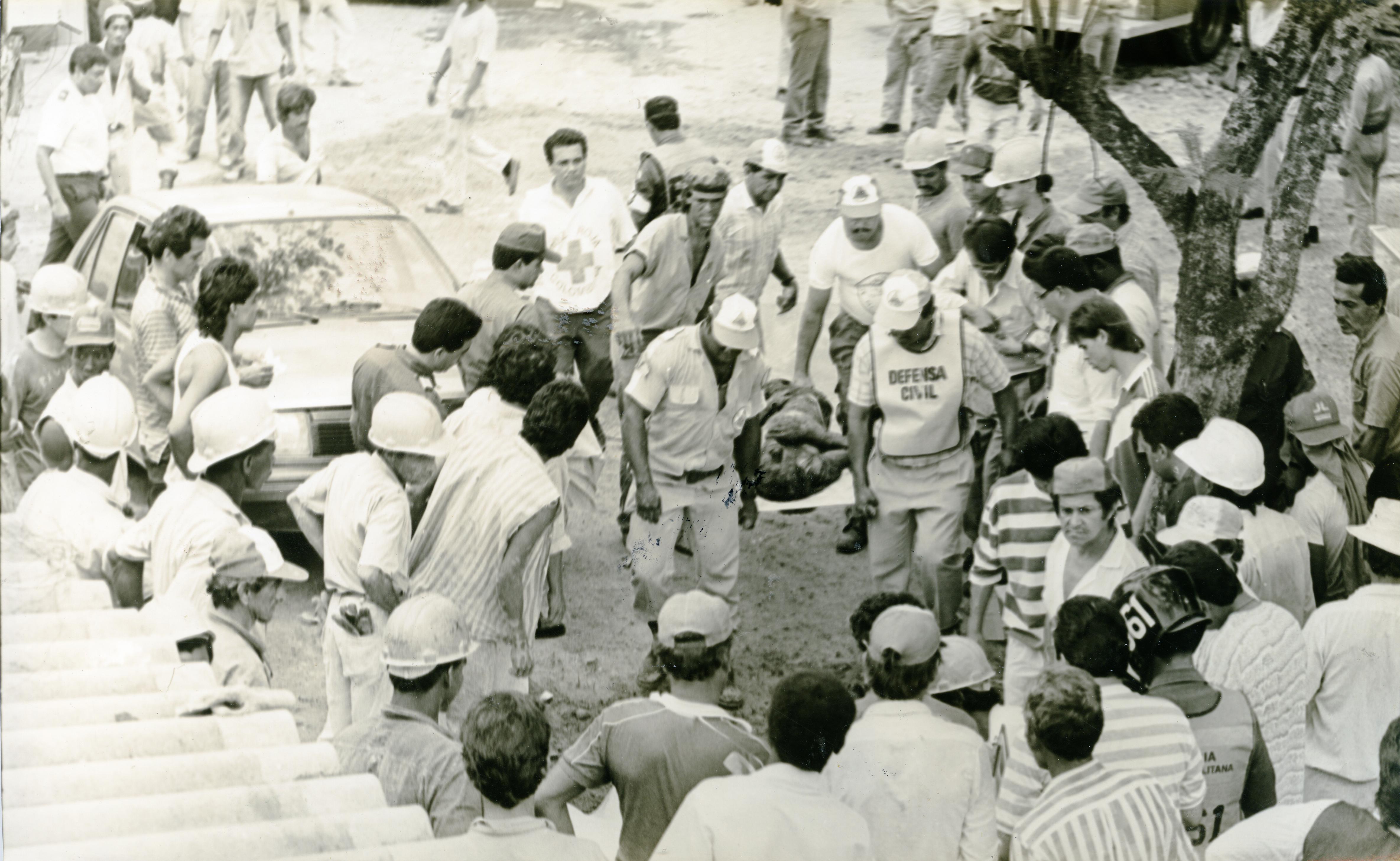 En la gráfica se observa la evacuación de una de las víctimas que dejó la caída de una losa de concreto, desde un octavo piso, en una construcción de Comfandi. Lo transportan obreros y miembros de la defensa civil y la cruz roja. Algunas personas alrededor observan en hecho.