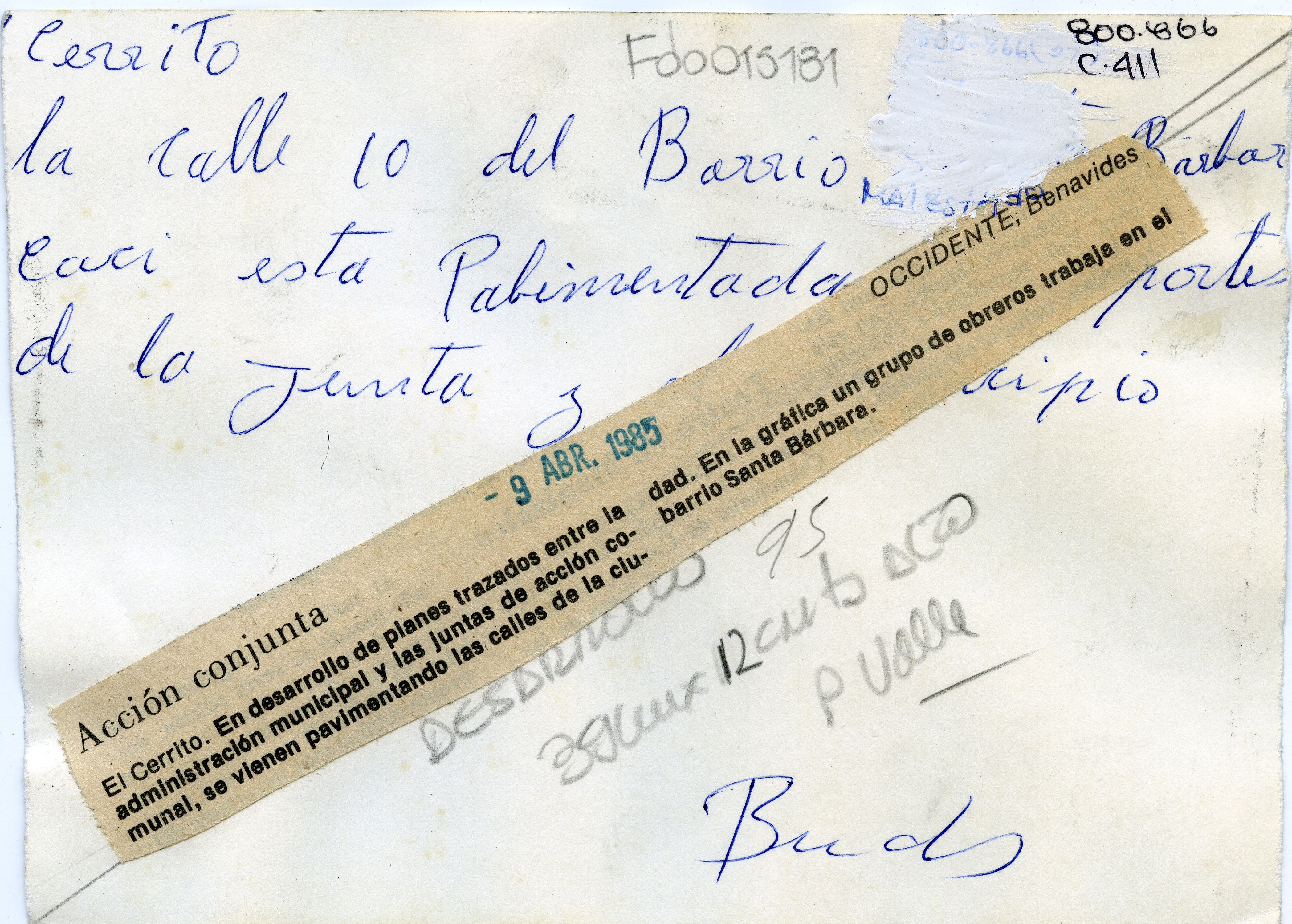Trabajos de pavimentación en el barrio Santa Barbara. Apreciamos trabajadores en sus labores. Al reverso de la fotografía se anexa el pie de foto del periódico: "Acción conjunta. El Cerrito. En desarrollo de planes atrasados entre la administración municipal y las juntas de acción comunal, se vienen pavimentando las calles de la ciudad. En la gráfica un grupo de obreros trabaja en el barrio Santa Barbara".
