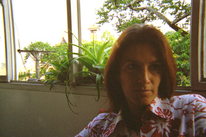 Plano Medio. En la imagen de formato horizontal se destaca una mujer al extremo inferior derecho, al fondo a través de una ventana se observa abundante vegetación. La imagen es tomada en el interior de la vivienda bajo escasas condiciones de luz.
