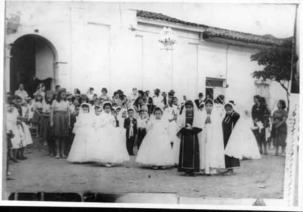 Grupo de niñas saliéndo del templo después de recibir la Primera Comunión. Vijes, C. 1950.