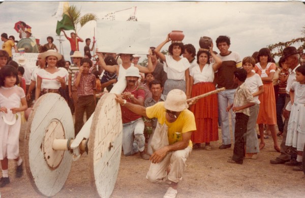 Celebración de festividades. Se destaca las diferentes alegorías de las antiguas carretas y vásijas para transportar el agua. Zarzal, C. 1980.