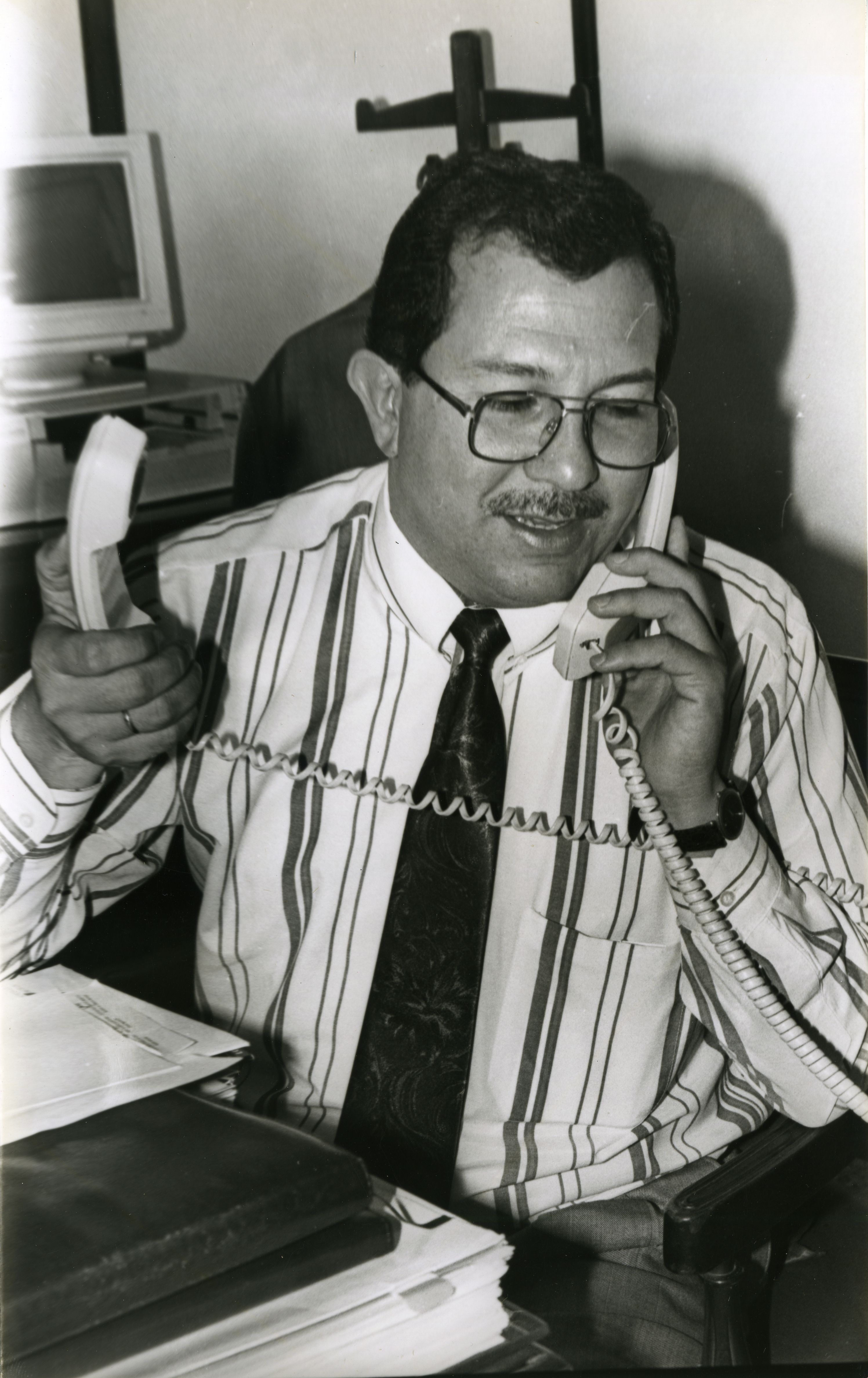 Gustavo Bustamante, exsecretario de gobierno de Medellín. Se aprecia sentado en el escritorio y sonriendo mientras habla por teléfono