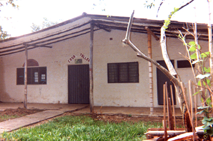 Plano medio. Imagen tomada en exterior, donde se puede apreciar la fachada de una vivienda con muros de color blanco. Al extremo derecho algunas plantas.