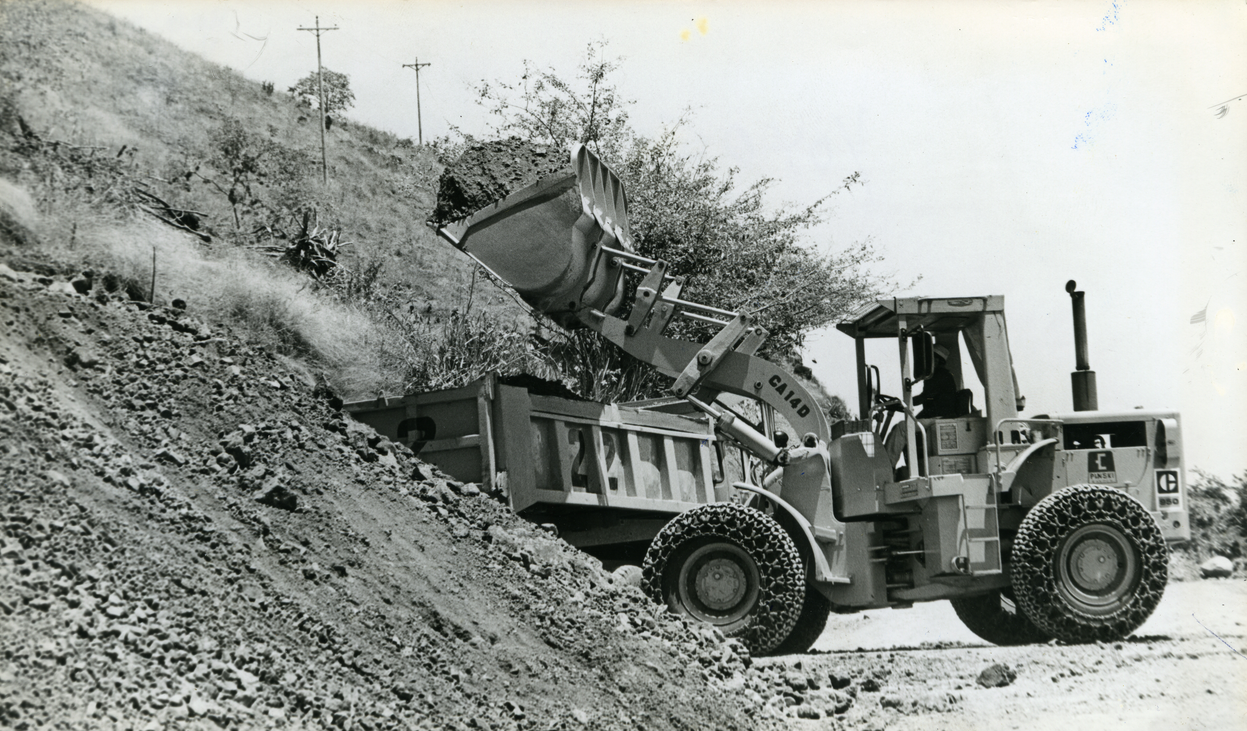 Tractor con cargador frontal y volqueta recogiendo tierra en la carretera de yotoco.
