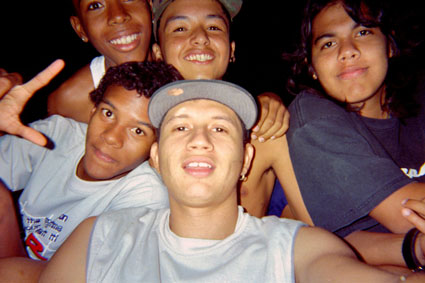 Plano medio. Toma realizada con luz de flash, de noche, donde se puede apreciar un grupo de jóvenes posando para la cámara, con expresión alegre.