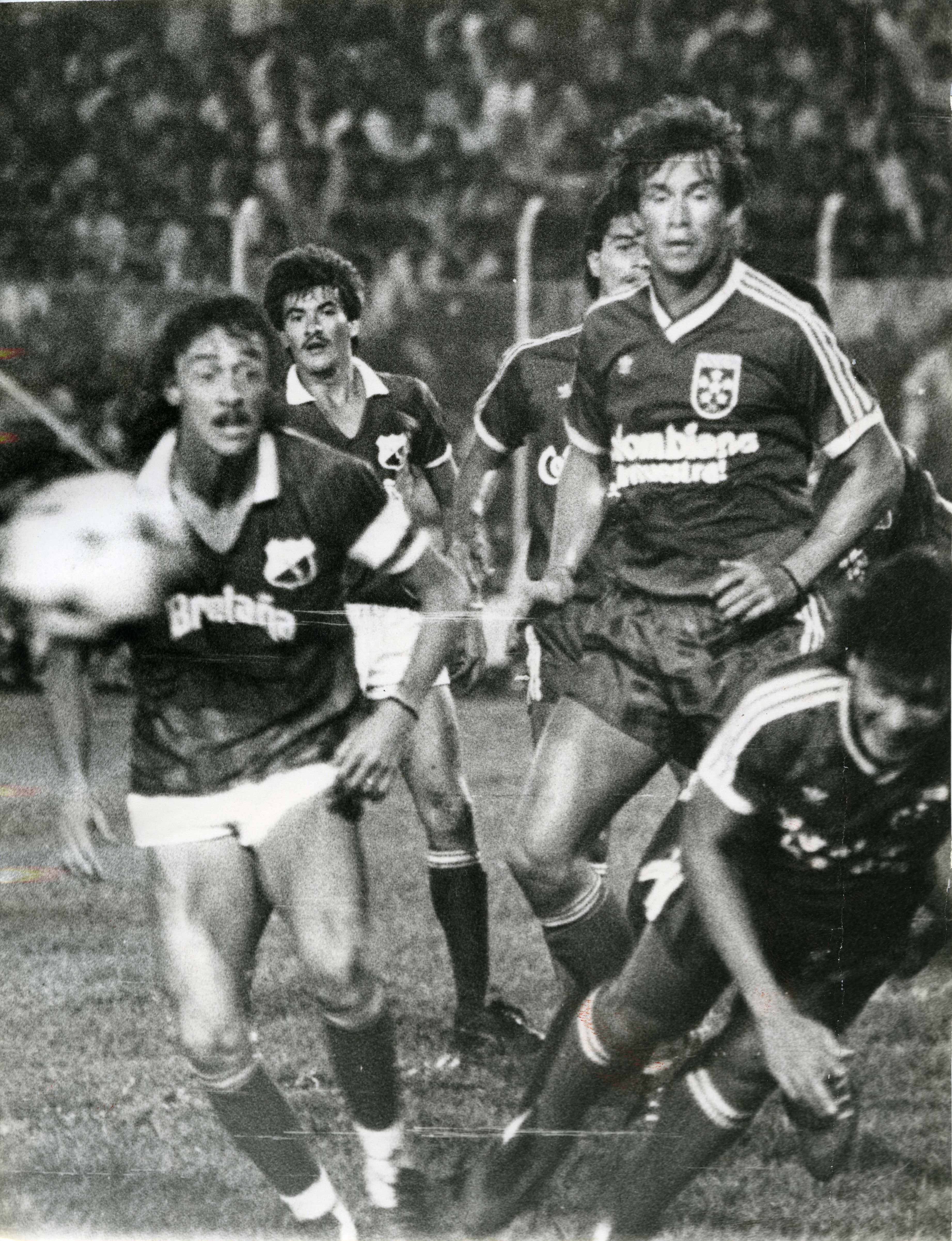Partido de fútbol entre los equipos América y Deportivo Cali jugado en el estadio Pascual Guerrero. Se aprecia disputa del balón por alto. Observamos público en la tribuna