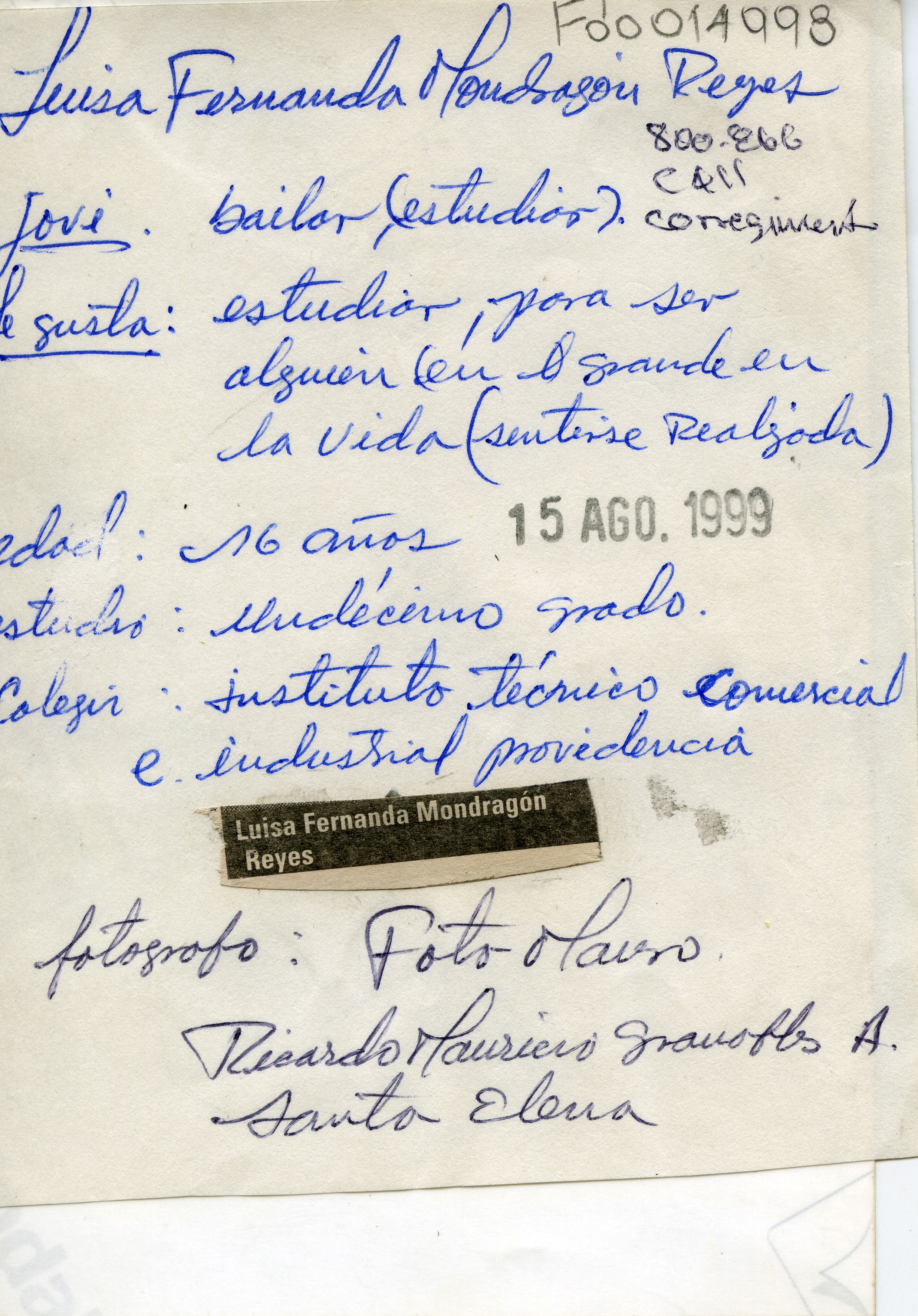 Luisa Fernanda Mondragón Reyes en el XXXII Fiesta de la uva en Santa Elena.Al reverso de la fotografía dice: "Luisa Fernanda Mondragón Reyes Jovi: bailar (estudios). Le gusta: Estudiar para ser alguien (en grande en al vida(sentirse realizada). Edad: 16 años. Estudio: Undécimo grado. Colegio: Instituto técnico comercial e industrial providencia"