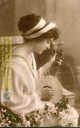 Señorita (por identificar). En la foto se observa la delicadeza de la imagen que denota una actitud angelical de una musa. Fotografía retocada manualmente con óleo en la cinta del vestido y en las rosas que componen el recuadro. Santiago de Cali, 1910.