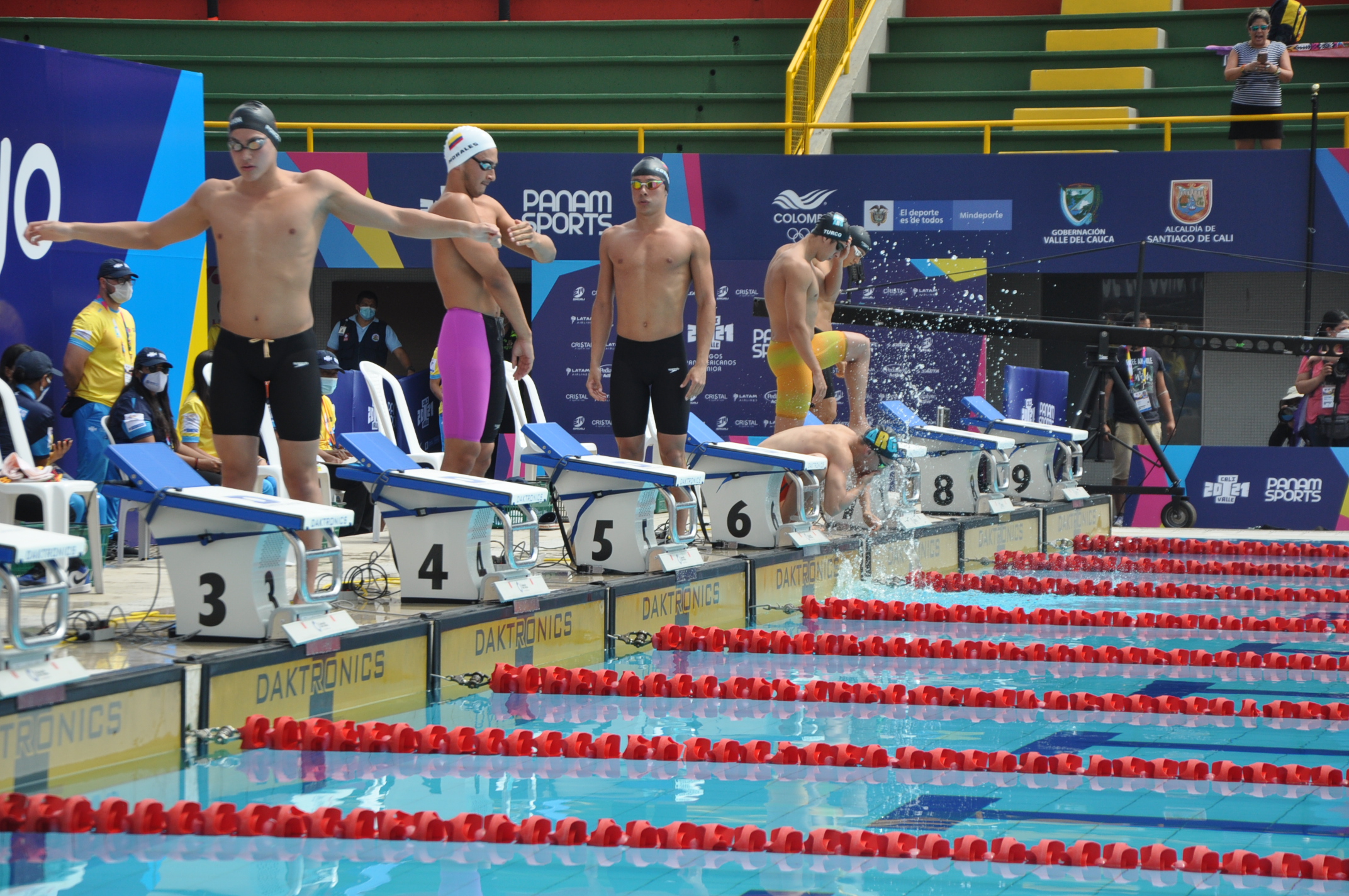 En la fotografía podemos observar a los participantes de la Competencia de natación, tomando sus lugares para dar inicio a la prueba en los"I Juegos Panamericanos Junior" llevados a cabo en la ciudad de Cali.