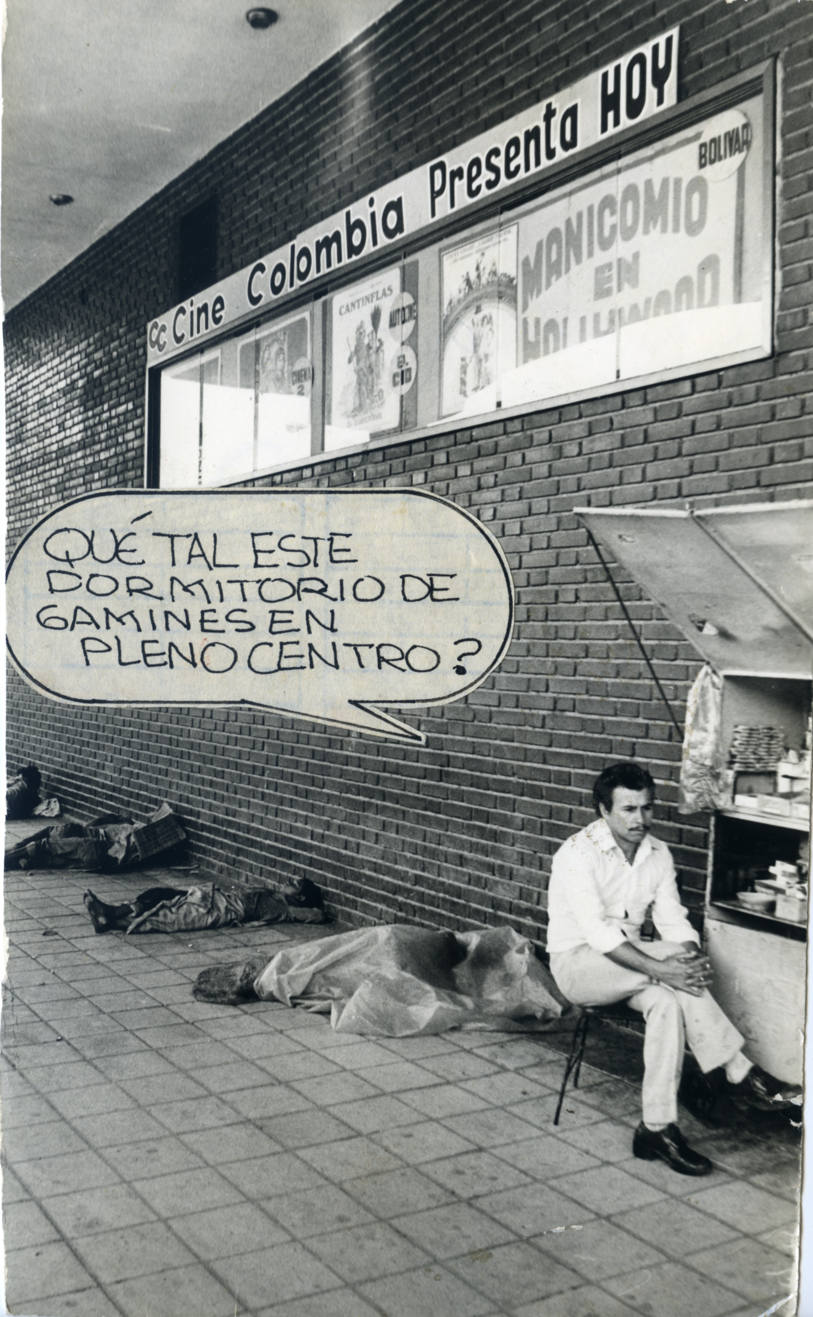 En el pie de foto dice lo siguiente: Gamines son niños que habitan en las calles por diferentes problemas sociales como económico, educación, político, entre otros.Observamos cuatro personas durmiendo en un andén al lado de Cine Colombia en pleno centro de Cali. Se aprecia un vendedor de confitería sentado en su puesto de trabajo