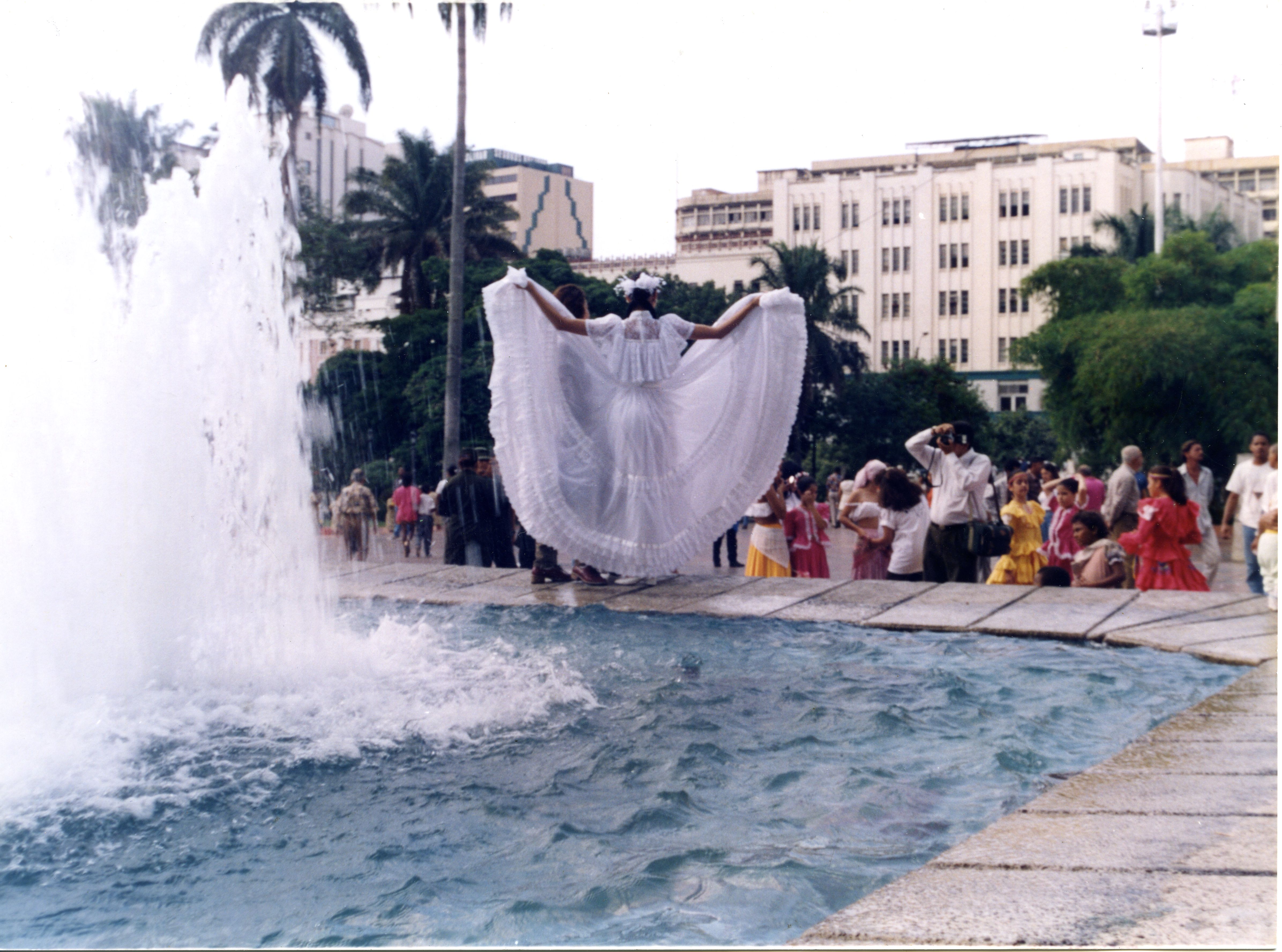 En la gráfica se observa a una mujer con un traje típico tomándose una foto sobre una fuente de agua mientras sus compañeras se encuentran en la parte inferior de la misma