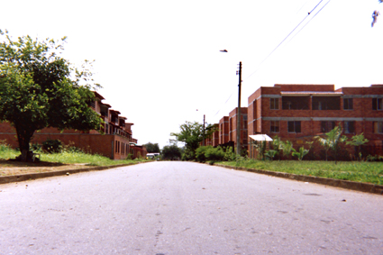 Plano general. Imagen tomada en exterior, donde se puede apreciar una vía pavimentada en el centro de la imagen y a cada extremo varias viviendas con muros de ladrillo a la vista.