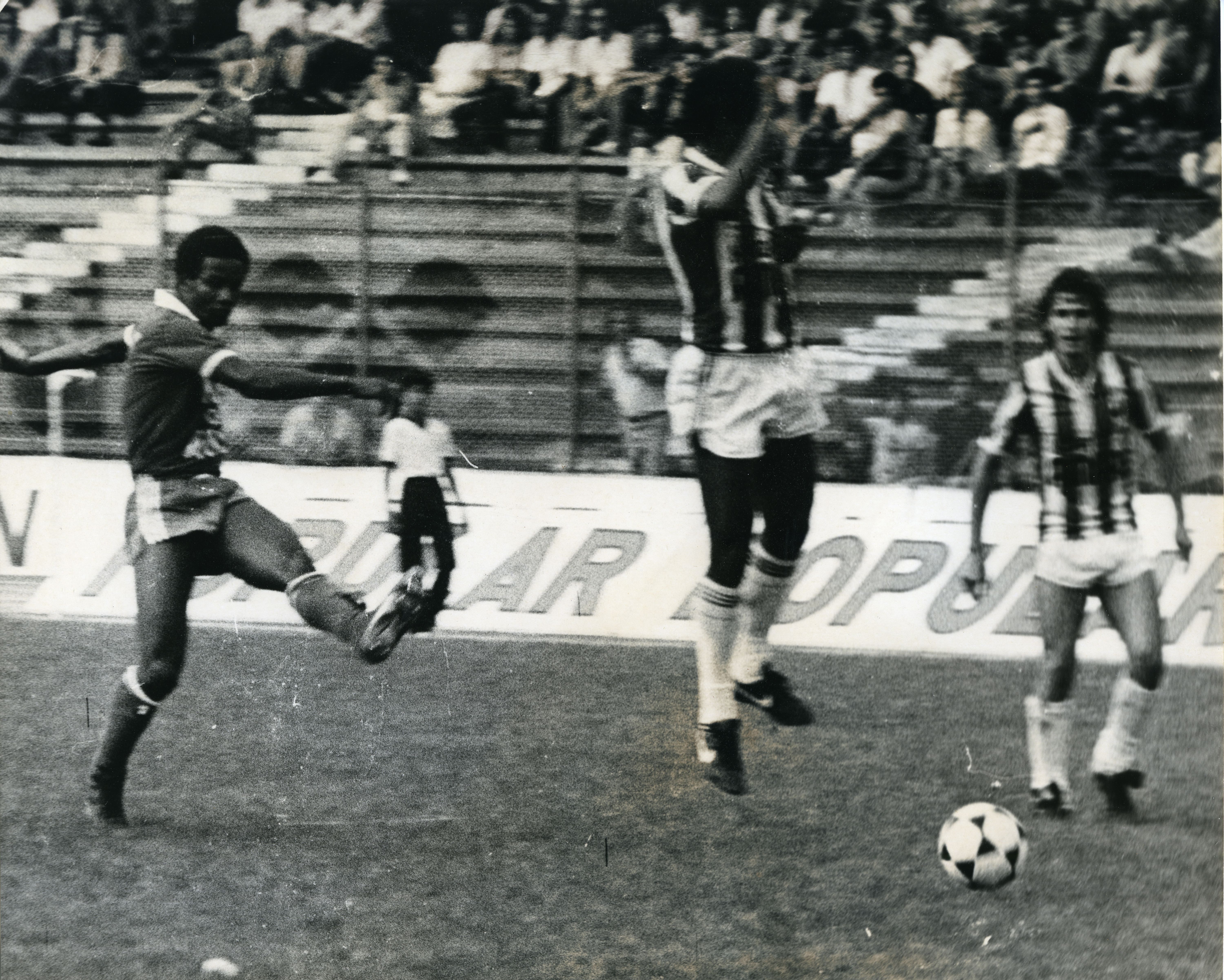 Deportivo Cali, club de fútbol colombiano del Valle del Cauca de la ciudad de Santiago de Cali, Sus inicios se remontan al 23 de noviembre de 1912 y posteriormente ha participado del fútbol profesional desde el año 1948 en donde ha obtenido 10 títulos como campeón del torneo colombiano al 2021, Campeón Copa Colombia 2010, Campeón Superliga de Colombia 2014, ha sido dos veces finalista de la Copa Libertadores de América. Partido entre los equipos de fútbol, Deportivo Cali y Nacional, realizado en el Estadio Olímpico Pascual Guerrero. El partido terminó 1-0 a fovar del equipo caleño. Se aprecia remate al arco del jugador caleño. Observamos público en la tribuna