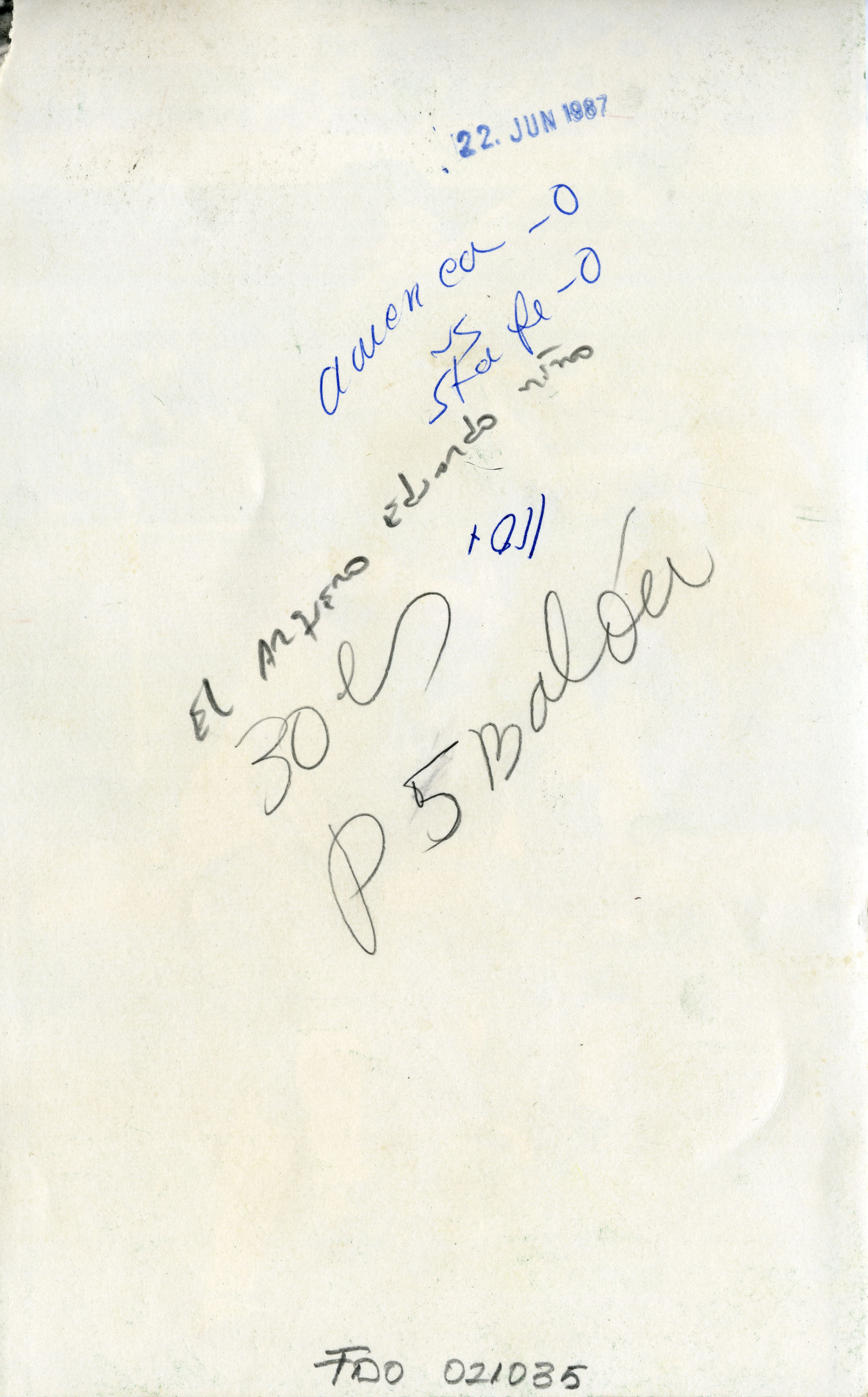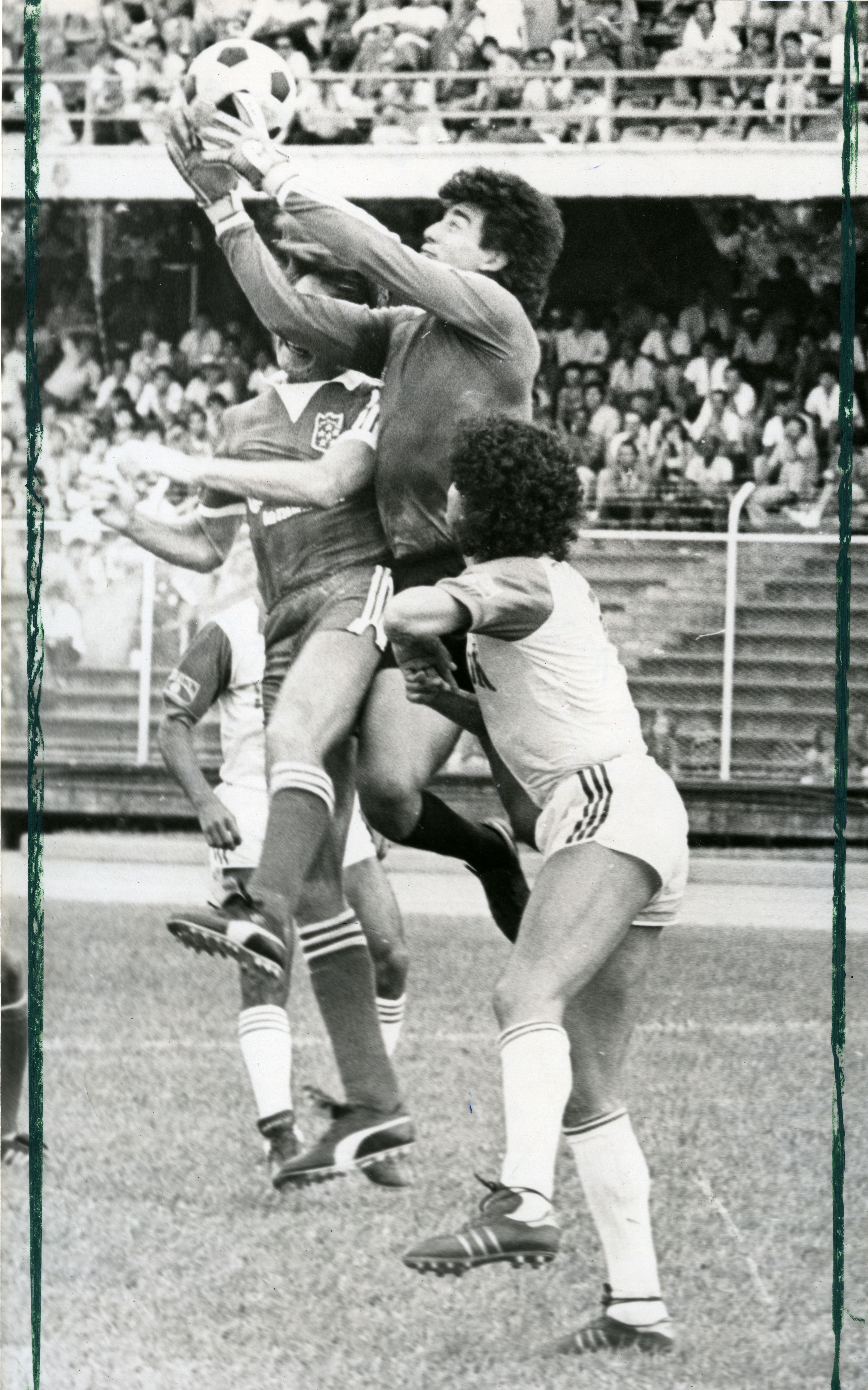 Partido entre los equipos América de Cali 0 vs Santa Fe 0, realizado en el estadio Olímpico Pascual Guerrero, Cali, Valle del Cauca. Se aprecia al portero Eduardo Niño ganando con dificultad el esférico