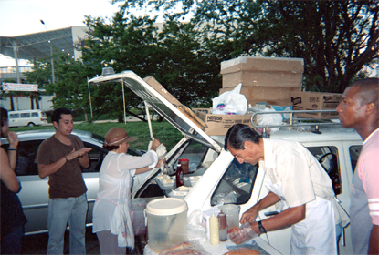 Se observa un vehículo en el cual se venden merengones. Personas afuera del vehículo. Al fondo centro comercial Palmetto Plaza. Plano general.