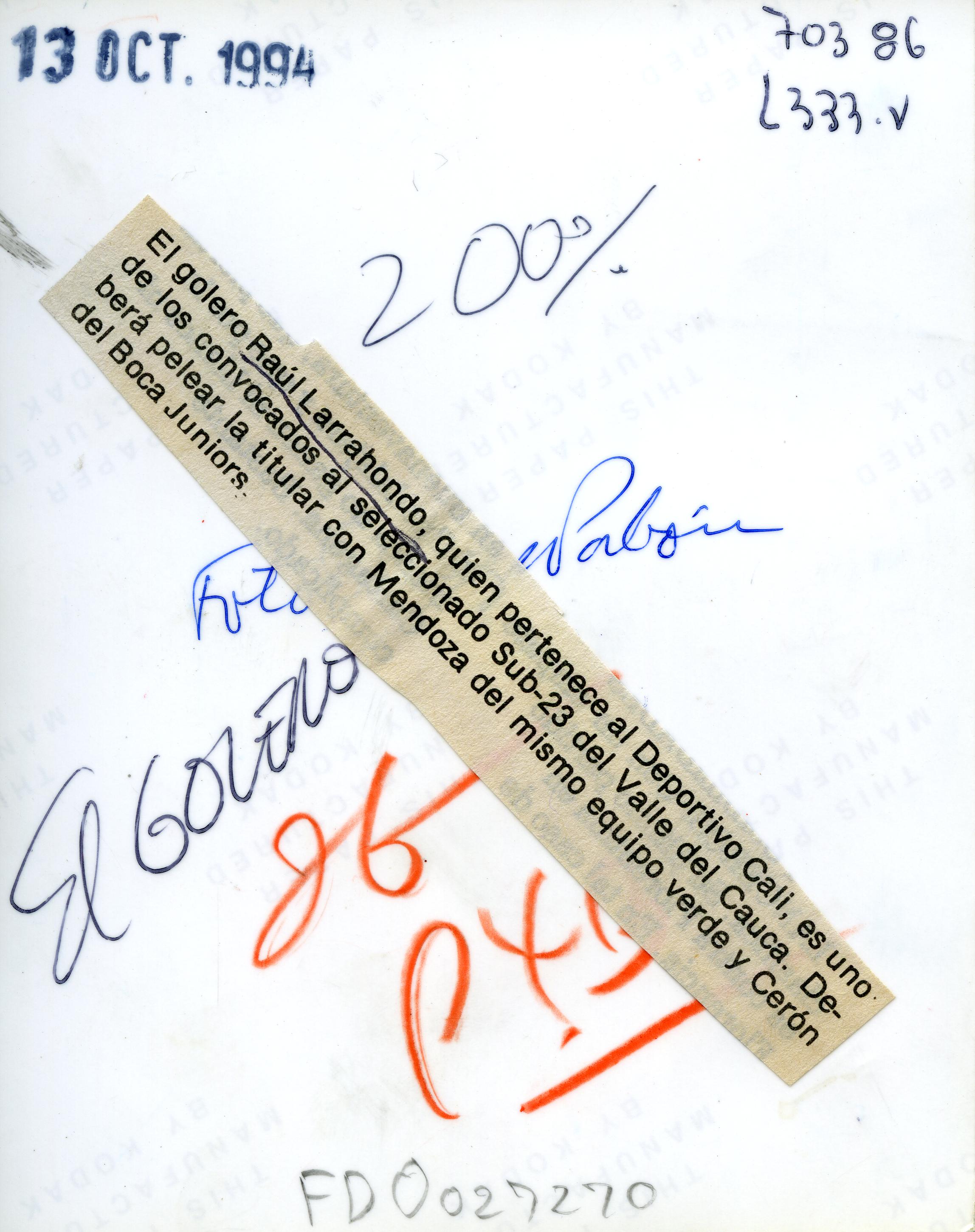 Reverso: El golero Raúl Larrahondo, quien pertenece al Deportivo Cali, es uno de los convocados al seleccionado Sub-23 del Valle del Cauca. Deberá pelear la titular con Mendoza del mismo equipo verde y Cerón del Boca Juniors.
