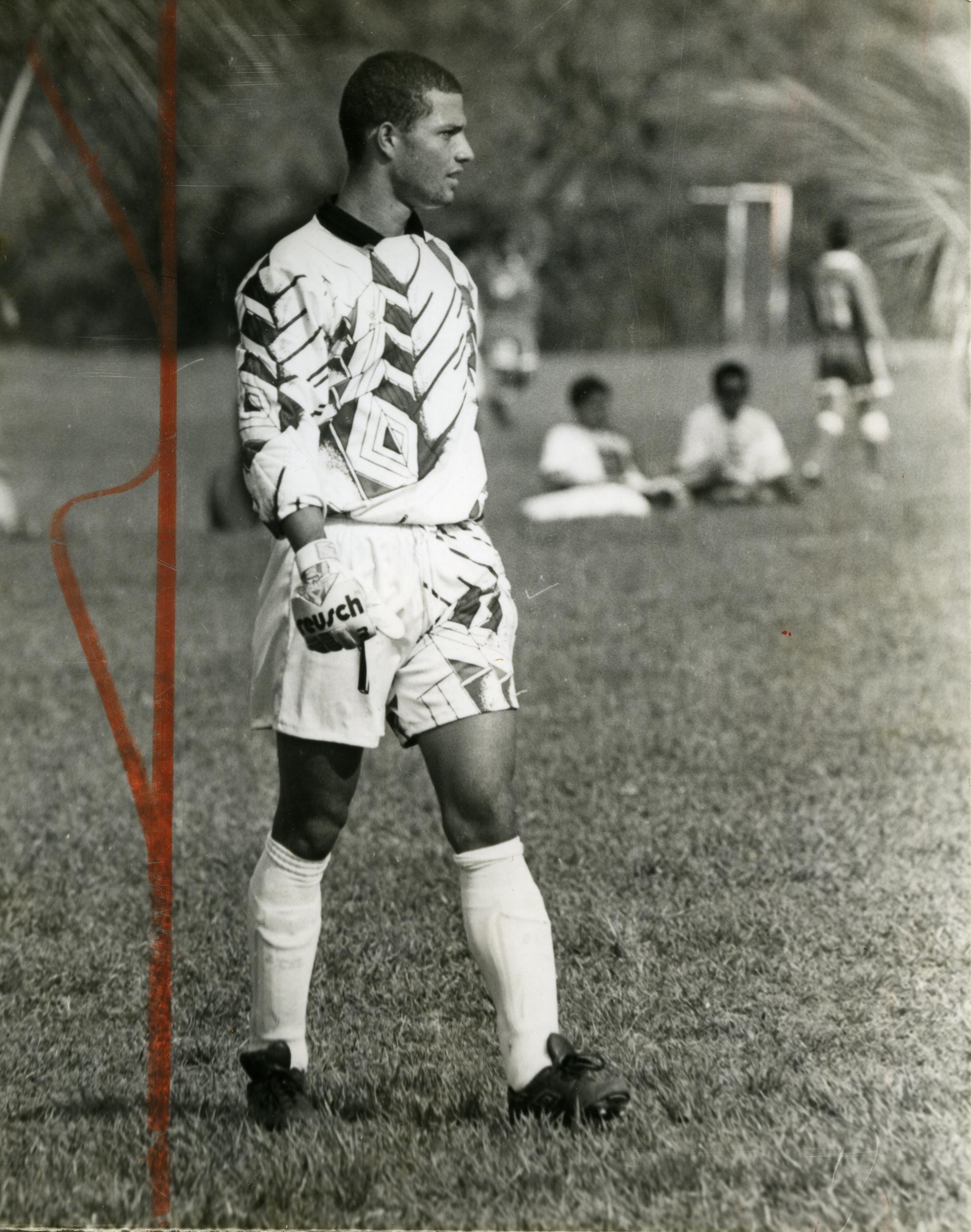 Retrato de cuerpo completo del futbolista Raúl Larrahondo en medio de una cancha de fútbol.