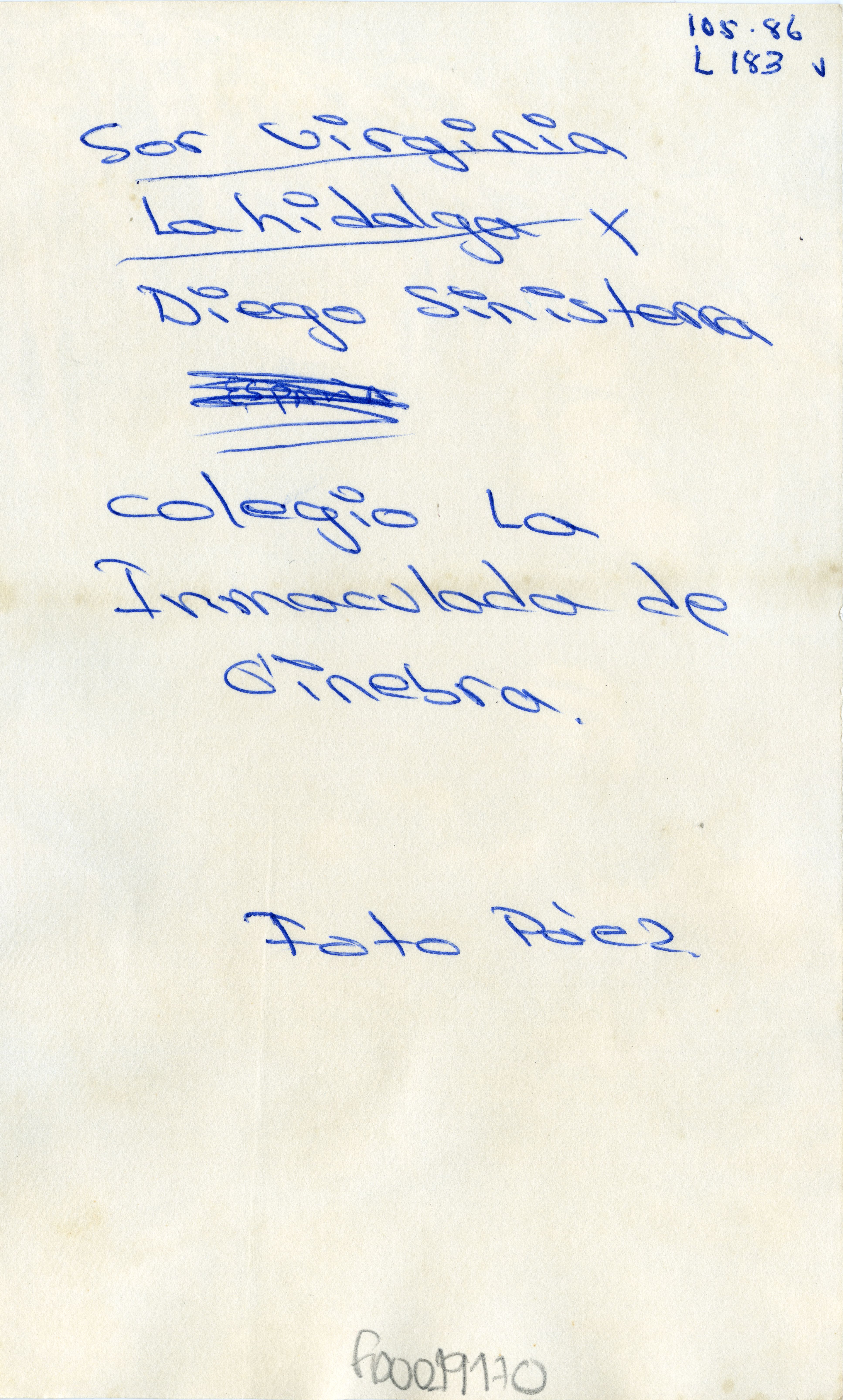 En el registro fotográfico podemos observar a la hermana Sor Virginia Lahidalga junto al señor Diego Sinisterra, en lo que parece un evento que se lleva a cabo en el Colegio La Inmaculada Concepción en el municipio de Ginebra. Al reverso de la fotografía se anexa nota manuscrita: "Sor Virginia Lahidalga y Diego Sinisterra. Colegio La Inmaculada de Ginebra. Foto Páez".