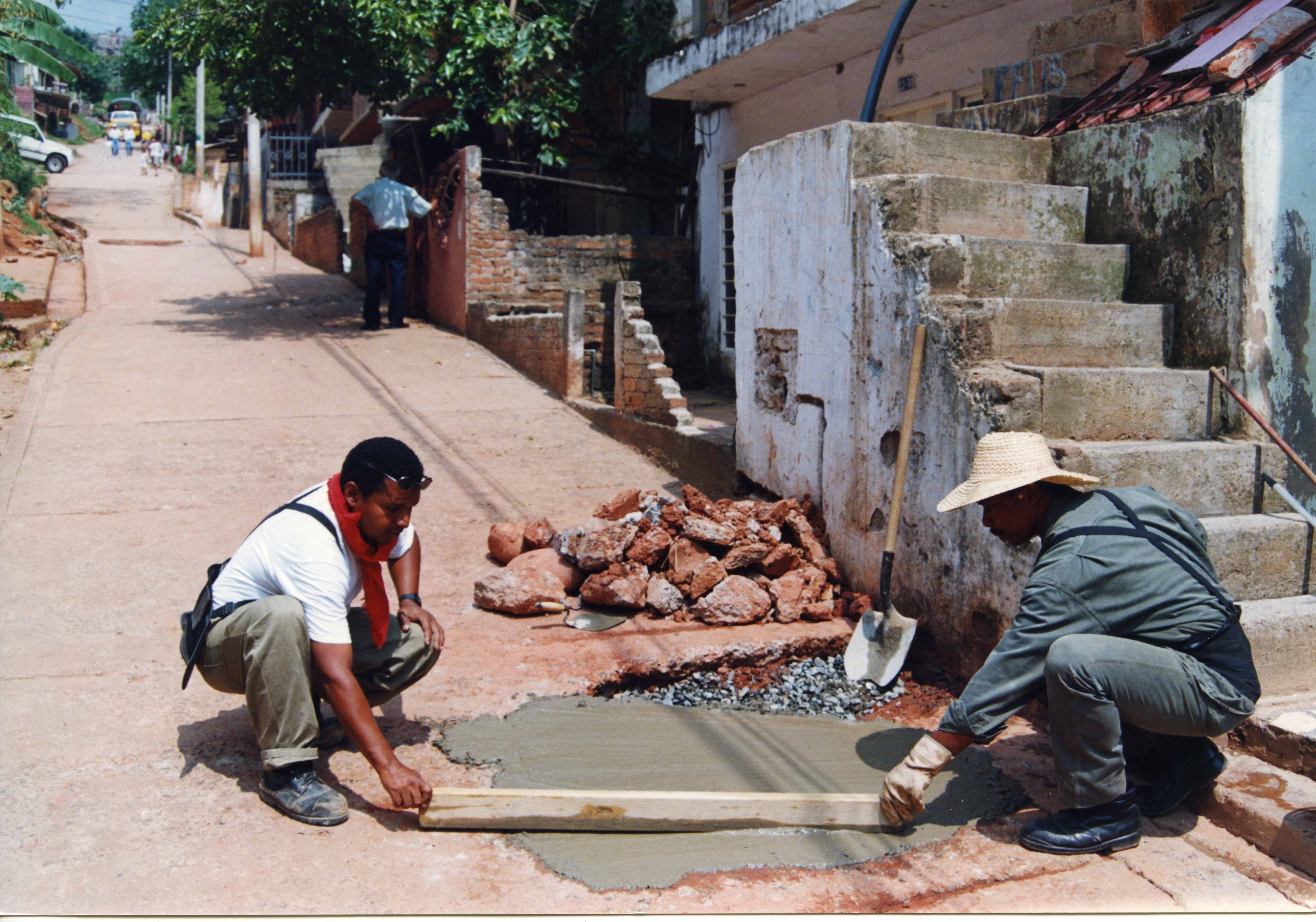 En el pie de foto dice lo siguiente: En la labor comunitaria se adelantaron obras en el alcantarillado y acueducto que beneficiaron a 150 mil personas de los barrios Siloé, La Estrella y El Cortijo.- El Archivo del Patrimonio Fotográfico y Fílmico del Valle del Cauca es responsabilidad de la Biblioteca Departamental del Valle Jorge Garcés Borrero, por convenio de cooperación suscrito con la Secretaria del Cultura Departamental, con el fin de aunar esfuerzos para su conservación, preservación y divulgación del Archivo entre la comunidad Vallecaucana, especialmente entre los estudiantes e investigadores que visitan la Biblioteca, propiciando el su uso y consulta permanente. La universidad Icesi es un colaborador en el proceso de difusión, facilitando la tecnología que permite la consulta de las imágenes.
