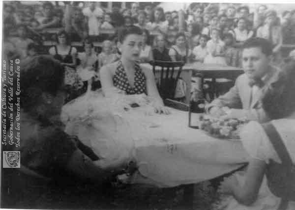 Luz Marina Cruz, Rafael Fajardo y otros personajes por identificar compartiendo en el Club del municipio de Vijes. C. 1975