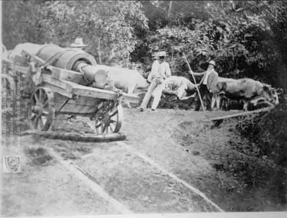 Bueyes y carretas utilizados como transporte, para las maquinarias del Ingenio Manuelita a fines del Siglo XIX