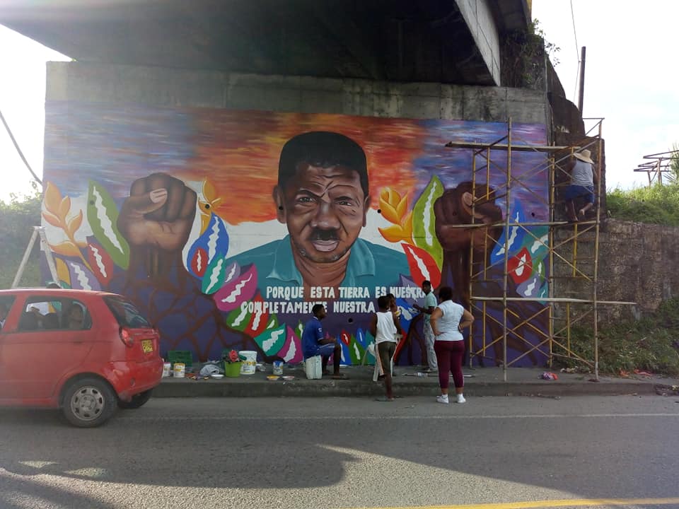 En la parte baja de un puente vehicular un grupo de manifestantes pinta un mural con un mensaje social "Porque esta tierra es nuestra, completamente nuestra.