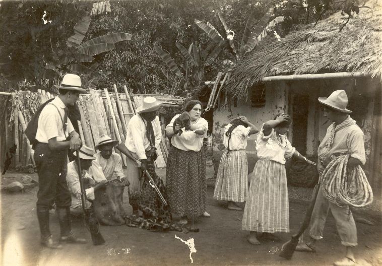 Sr. Ernesto Salcedo, Elvia Álvarez Rengifo y Virginia Álvarez Rengifo. Representación cinematográfica de la María de Jorge Isaacs, novela del romanticismo más importante del siglo XIX, en el Valle del Cauca. Hacienda el Paraido - El Cerrito, fecha aproximada, 1920.