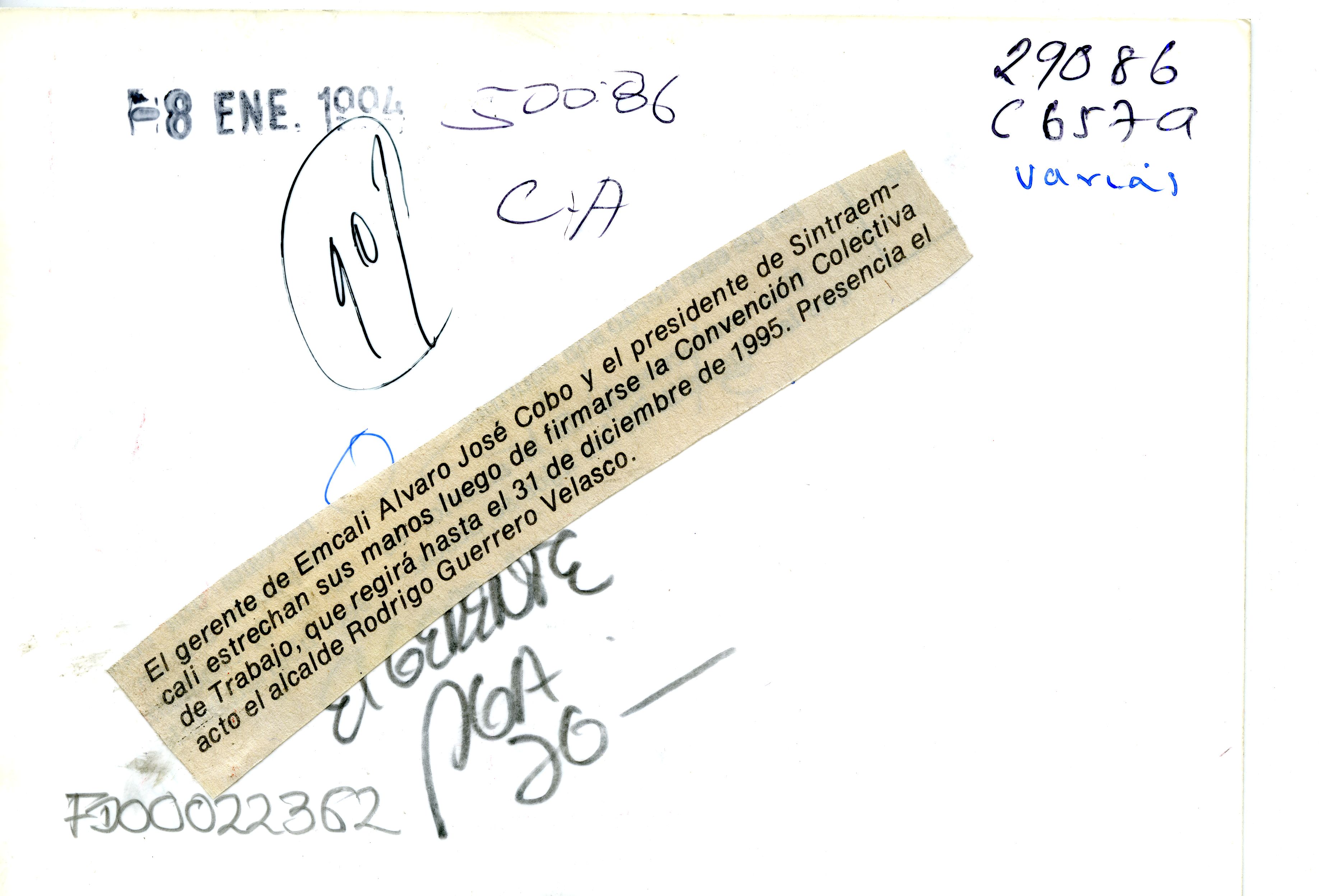 Se anexa recorte al reverso: "El gerente de Emcali Álvaro José Cobo y el presidente de Sintraemcali estrechan sus manos luego de firmarse la Convención Colectiva de Trabajo que regirá hasta el 31 de diciembre de 1995. Presencia el acto el alcalde Rodrigo Guerrero Velasco."